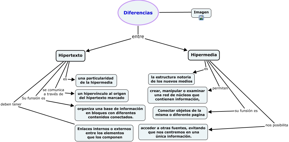 Este Cmap, tiene información relacionada con: Eliana, Diferencias ???? Imagen, Hipermedia es la estructura notoria de los nuevos medios, Hipermedia nos posibilita acceder a otras fuentes, evitando que nos centremos en una única información., Hipertexto es una particularidad de la hipermedia, Hipermedia su funsión es Conectar objetos de la misma o diferente pagina, Hipertexto se comunica a través de un hipervínculo al origen del hipertexto marcado, Hipertexto deben tener Enlaces internos o externos entre los elementos que los componen, Diferencias entre Hipermedia, Hipertexto Su funsión es organiza una base de información en bloques con diferentes contenidos conectados., Hipermedia permiten crear, manipular o examinar una red de núcleos que contienen información,, Diferencias entre Hipertexto