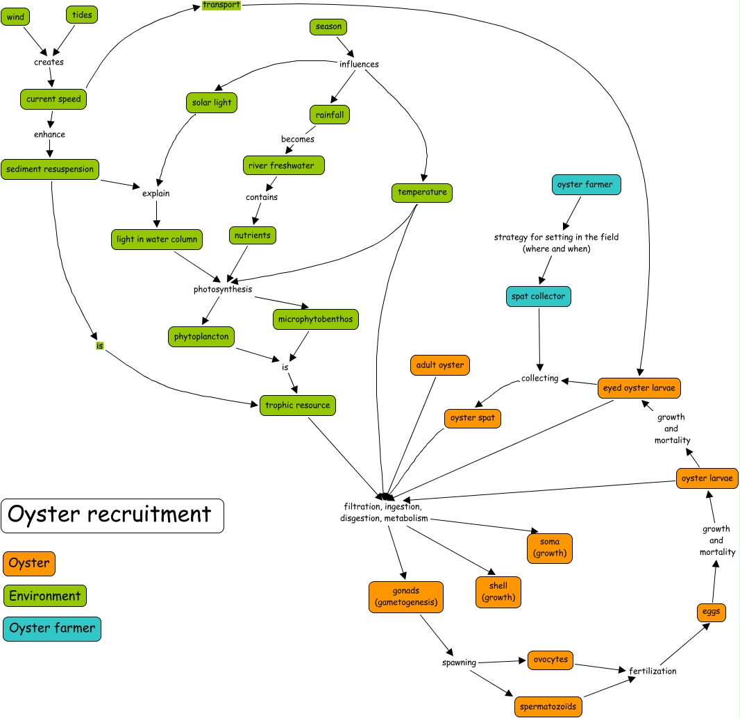Cette carte de concepts créée avec IHMC CmapTools traite de: recrutement ancorim, gonads (gametogenesis) spawning ovocytes, river freshwater contains nutrients, oyster larvae growth and mortality eyed oyster larvae, adult oyster filtration, ingestion, disgestion, metabolism gonads (gametogenesis), temperature filtration, ingestion, disgestion, metabolism soma (growth), adult oyster filtration, ingestion, disgestion, metabolism shell (growth), season influences solar light, sediment resuspension is trophic resource, light in water column photosynthesis phytoplancton, eyed oyster larvae filtration, ingestion, disgestion, metabolism soma (growth), tides creates current speed, season influences temperature, oyster spat filtration, ingestion, disgestion, metabolism soma (growth), sediment resuspension explain light in water column, oyster spat filtration, ingestion, disgestion, metabolism shell (growth), light in water column photosynthesis microphytobenthos, eyed oyster larvae collecting oyster spat, oyster larvae filtration, ingestion, disgestion, metabolism soma (growth), oyster larvae filtration, ingestion, disgestion, metabolism gonads (gametogenesis), adult oyster filtration, ingestion, disgestion, metabolism soma (growth)
