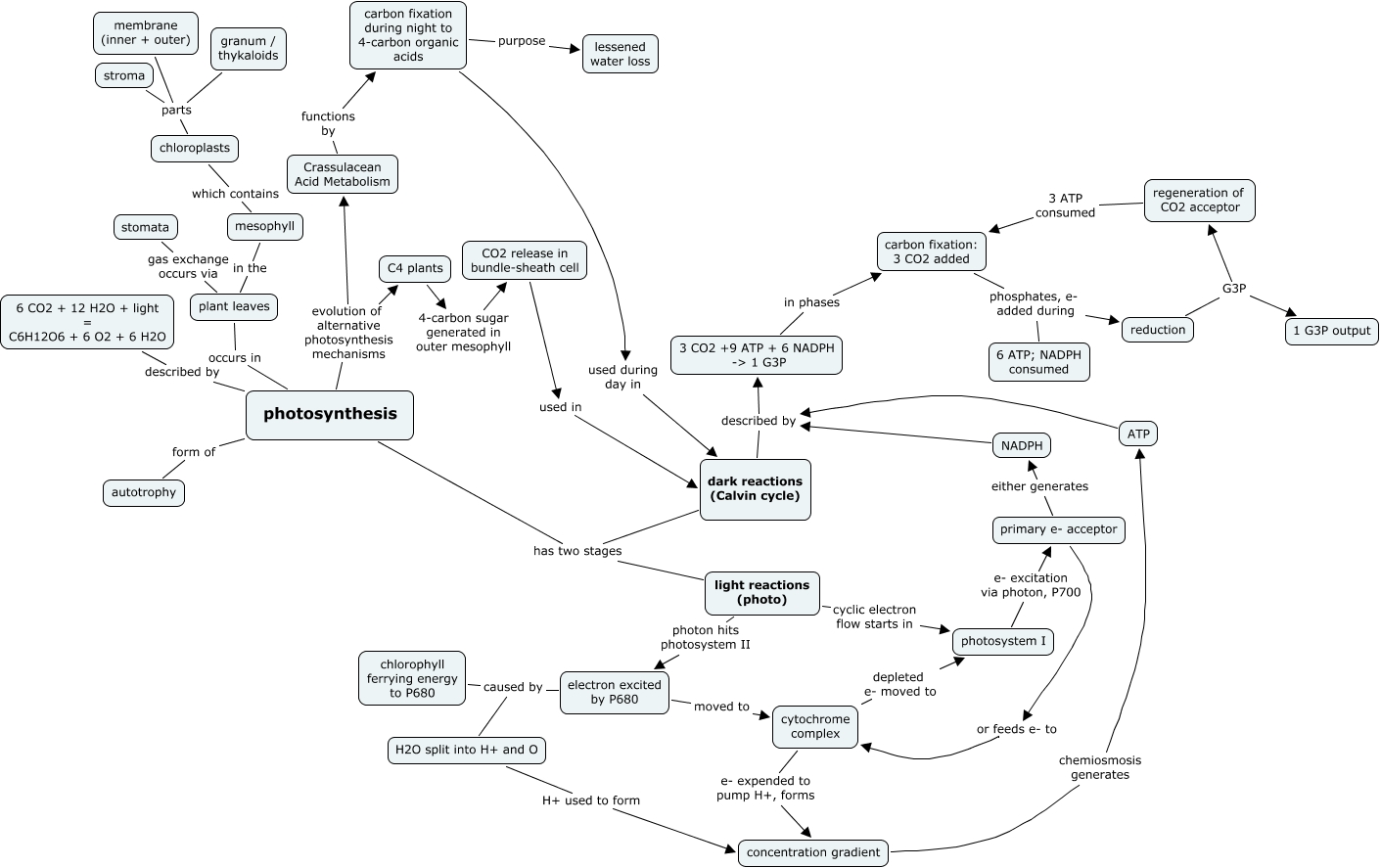 This Concept Map, created with IHMC CmapTools, has information related to: PHOTOSYNTHESIS CONCEPT MAP, ATP described by 3 CO2 +9 ATP + 6 NADPH -> 1 G3P, carbon fixation during night to 4-carbon organic acids purpose lessened water loss, mesophyll which contains chloroplasts, light reactions (photo) cyclic electron flow starts in photosystem I, carbon fixation: 3 CO2 added phosphates, e- added during reduction, photosynthesis described by 6 CO2 + 12 H2O + light = C6H12O6 + 6 O2 + 6 H2O, photosynthesis has two stages dark reactions (Calvin cycle), 3 CO2 +9 ATP + 6 NADPH -> 1 G3P in phases carbon fixation: 3 CO2 added, NADPH described by 3 CO2 +9 ATP + 6 NADPH -> 1 G3P, Crassulacean Acid Metabolism functions by carbon fixation during night to 4-carbon organic acids, photosynthesis occurs in plant leaves, H2O split into H+ and O H+ used to form concentration gradient, regeneration of CO2 acceptor 3 ATP consumed carbon fixation: 3 CO2 added, photosynthesis form of autotrophy, carbon fixation during night to 4-carbon organic acids used during day in dark reactions (Calvin cycle), cytochrome complex e- expended to pump H+, forms concentration gradient, cytochrome complex depleted e- moved to photosystem I, carbon fixation: 3 CO2 added phosphates, e- added during 6 ATP; NADPH consumed, electron excited by P680 caused by H2O split into H+ and O, concentration gradient chemiosmosis generates ATP