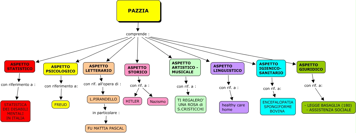 Questa Cmap, creata con IHMC CmapTools, contiene informazioni relative a: PAZZIA1-tesina Ceraso - 5Bdir 2011-corretta, PAZZIA comprende : ASPETTO STORICO, PAZZIA comprende : ASPETTO STATISTICO, ASPETTO PSICOLOGICO con riferimento a: FREUD, PAZZIA comprende : ASPETTO LETTERARIO, PAZZIA comprende : ASPETTO LINGUISTICO, L.PIRANDELLO in particolare : FU MATTIA PASCAL, ASPETTO ARTISTICO - MUSICALE con rif. a : TI REGALERO' UNA ROSA di S.CRISTICCHI, ASPETTO IGIENICO- SANITARIO con rif. a: ENCEFALOPATIA SPONGIFORME BOVINA, PAZZIA comprende : ASPETTO PSICOLOGICO, ASPETTO LETTERARIO con rif. all'opera di : L.PIRANDELLO, ASPETTO LINGUISTICO con rif. a : healthy care home, ASPETTO STORICO con rif. a : HITLER, ASPETTO STORICO con rif. a : Nazismo, ASPETTO STATISTICO con riferimento a : STATISTICA DEI DISABILI MENTALI IN ITALIA, PAZZIA comprende : ASPETTO GIURIDICO, PAZZIA comprende : ASPETTO ARTISTICO - MUSICALE, ASPETTO GIURIDICO con rif. a: - LEGGE BASAGLIA (180) - ASSISTENZA SOCIALE, PAZZIA comprende : ASPETTO IGIENICO- SANITARIO