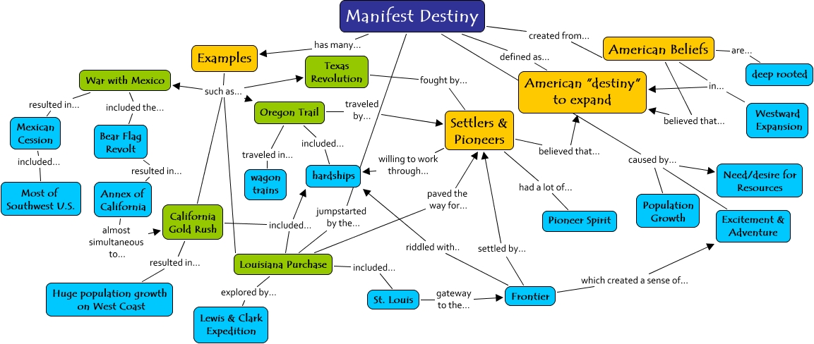 This Concept Map, created with IHMC CmapTools, has information related to: Manifest Destiny Concept Map, Examples such as... California Gold Rush, Manifest Destiny has many... Examples, Oregon Trail traveled in... wagon trains, Louisiana Purchase included... hardships, Frontier settled by... Settlers & Pioneers, American Beliefs believed that... American "destiny" to expand, Settlers & Pioneers willing to work through... hardships, Oregon Trail included... hardships, Bear Flag Revolt resulted in... Annex of California, Manifest Destiny caused by... Population Growth, Louisiana Purchase paved the way for... Settlers & Pioneers, Examples such as... War with Mexico, Examples such as... Texas Revolution, Examples such as... Louisiana Purchase, American Beliefs in... Westward Expansion, Manifest Destiny jumpstarted by the... Louisiana Purchase, War with Mexico included the... Bear Flag Revolt, Frontier riddled with.. hardships, Settlers & Pioneers believed that... American "destiny" to expand, Louisiana Purchase explored by... Lewis & Clark Expedition