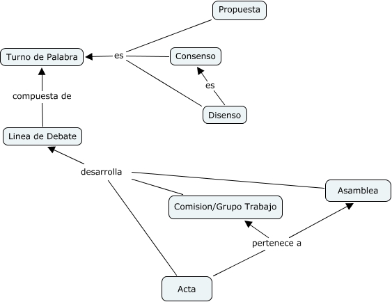 Este Cmap, tiene información relacionada con: Acta, Linea de Debate compuesta de Turno de Palabra, Comision/Grupo Trabajo desarrolla Linea de Debate, Disenso es Consenso, Disenso es Turno de Palabra, Asamblea desarrolla Linea de Debate, Consenso es Turno de Palabra, Acta pertenece a Asamblea, Acta desarrolla Linea de Debate, Acta pertenece a Comision/Grupo Trabajo, Propuesta es Turno de Palabra