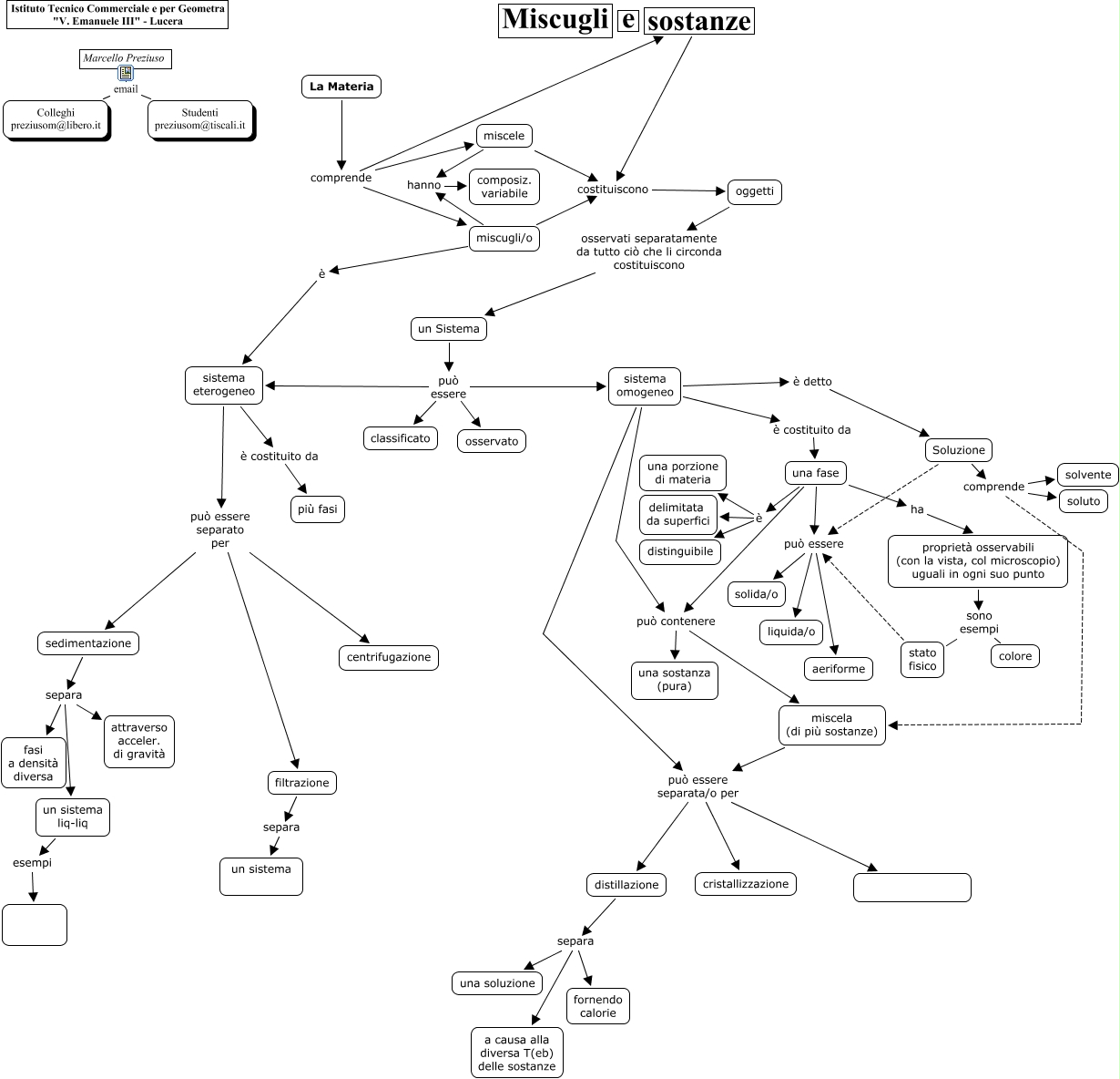 Questa Cmap, creata con IHMC CmapTools, contiene informazioni relative a: Miscugli e sostanze - C1, sistema omogeneo può essere separata/o per, sistema omogeneo è detto Soluzione, Soluzione comprende miscela (di più sostanze), una fase può contenere una sostanza (pura), stato fisico può essere liquida/o, distillazione separa una soluzione, Marcello Preziuso email Studenti preziusom@tiscali.it, sedimentazione separa un sistema liq-liq, La Materia comprende sostanze, una fase può contenere miscela (di più sostanze), Soluzione comprende soluto, una fase è una porzione di materia, sistema eterogeneo è costituito da più fasi, sistema omogeneo può contenere una sostanza (pura), un sistema liq-liq esempi, una fase è delimitata da superfici, Soluzione può essere solida/o, un Sistema può essere osservato, un Sistema può essere sistema eterogeneo, sostanze costituiscono oggetti