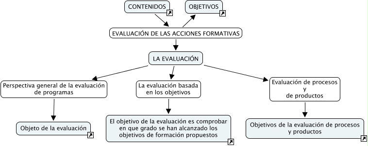 Este Cmap, tiene información relacionada con: Punto1, LA EVALUACIÓN Evaluación de procesos y de productos Objetivos de la evaluación de procesos y productos, CONTENIDOS EVALUACIÓN DE LAS ACCIONES FORMATIVAS LA EVALUACIÓN, LA EVALUACIÓN Perspectiva general de la evaluación de programas Objeto de la evaluación, CONTENIDOS EVALUACIÓN DE LAS ACCIONES FORMATIVAS OBJETIVOS, CONTENIDOS EVALUACIÓN DE LAS ACCIONES FORMATIVAS LA EVALUACIÓN, LA EVALUACIÓN La evaluación basada en los objetivos El objetivo de la evaluación es comprobar en que grado se han alcanzado los objetivos de formación propuestos