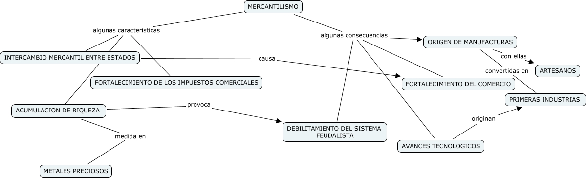 Este Cmap, tiene información relacionada con: mercantilismo, ACUMULACION DE RIQUEZA medida en METALES PRECIOSOS, INTERCAMBIO MERCANTIL ENTRE ESTADOS causa FORTALECIMIENTO DEL COMERCIO, MERCANTILISMO algunas caracteristicas ACUMULACION DE RIQUEZA, AVANCES TECNOLOGICOS originan PRIMERAS INDUSTRIAS, MERCANTILISMO algunas consecuencias AVANCES TECNOLOGICOS, MERCANTILISMO algunas consecuencias DEBILITAMIENTO DEL SISTEMA FEUDALISTA, MERCANTILISMO algunas consecuencias ORIGEN DE MANUFACTURAS, ORIGEN DE MANUFACTURAS convertidas en PRIMERAS INDUSTRIAS, MERCANTILISMO algunas consecuencias FORTALECIMIENTO DEL COMERCIO, ORIGEN DE MANUFACTURAS con ellas ARTESANOS, MERCANTILISMO algunas caracteristicas INTERCAMBIO MERCANTIL ENTRE ESTADOS, ACUMULACION DE RIQUEZA provoca DEBILITAMIENTO DEL SISTEMA FEUDALISTA, MERCANTILISMO algunas caracteristicas FORTALECIMIENTO DE LOS IMPUESTOS COMERCIALES