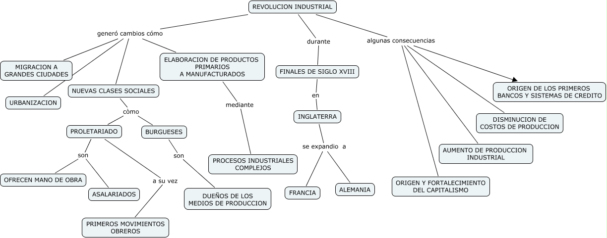 Este Cmap, tiene información relacionada con: Revolución Industrial, BURGUESES son DUEÑOS DE LOS MEDIOS DE PRODUCCION, PROLETARIADO a su vez PRIMEROS MOVIMIENTOS OBREROS, INGLATERRA se expandio a FRANCIA, REVOLUCION INDUSTRIAL generó cambios cómo MIGRACION A GRANDES CIUDADES, REVOLUCION INDUSTRIAL generó cambios cómo NUEVAS CLASES SOCIALES, REVOLUCION INDUSTRIAL generó cambios cómo URBANIZACION, REVOLUCION INDUSTRIAL algunas consecuencias AUMENTO DE PRODUCCION INDUSTRIAL, REVOLUCION INDUSTRIAL algunas consecuencias DISMINUCION DE COSTOS DE PRODUCCION, REVOLUCION INDUSTRIAL algunas consecuencias ORIGEN Y FORTALECIMIENTO DEL CAPITALISMO, NUEVAS CLASES SOCIALES còmo BURGUESES, REVOLUCION INDUSTRIAL durante FINALES DE SIGLO XVIII, PROLETARIADO son ASALARIADOS, INGLATERRA se expandio a ALEMANIA, REVOLUCION INDUSTRIAL generó cambios cómo ELABORACION DE PRODUCTOS PRIMARIOS A MANUFACTURADOS, REVOLUCION INDUSTRIAL algunas consecuencias ORIGEN DE LOS PRIMEROS BANCOS Y SISTEMAS DE CREDITO, ELABORACION DE PRODUCTOS PRIMARIOS A MANUFACTURADOS mediante PROCESOS INDUSTRIALES COMPLEJOS, PROLETARIADO son OFRECEN MANO DE OBRA, NUEVAS CLASES SOCIALES còmo PROLETARIADO, FINALES DE SIGLO XVIII en INGLATERRA