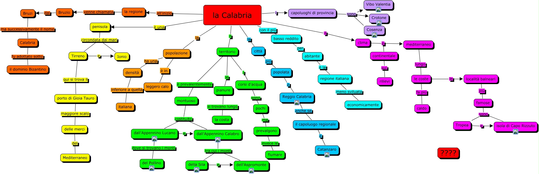 Questa Cmap, creata con IHMC CmapTools, contiene informazioni relative a: Calabria_Facciolati, abitante è la regione italiana, della Sila e dell'Aspromonte, la Calabria la popolazione, territorio le pianure, la regione venne chiamata Bruzio, penisola circondata dai mari Ionio, dall'Appennino Calabro tra cui i monti della Sila, dall'Appennino Calabro tra cui i monti dell'Aspromonte, le coste le località balneari, clima è mediterraneo, località balneari più famose, montuoso costituito dall'Appennino Lucano, popolazione ha una densità, territorio i corsi d'acqua, dall'Appennino Lucano dove si trovano i monti del Pollino, continentale sui rilievi, pochi ma prevalgono, basso reddito per abitante, Tirreno qui si trova il porto di Gioia Tauro, isola di Capo Rizzuto sono Tropea