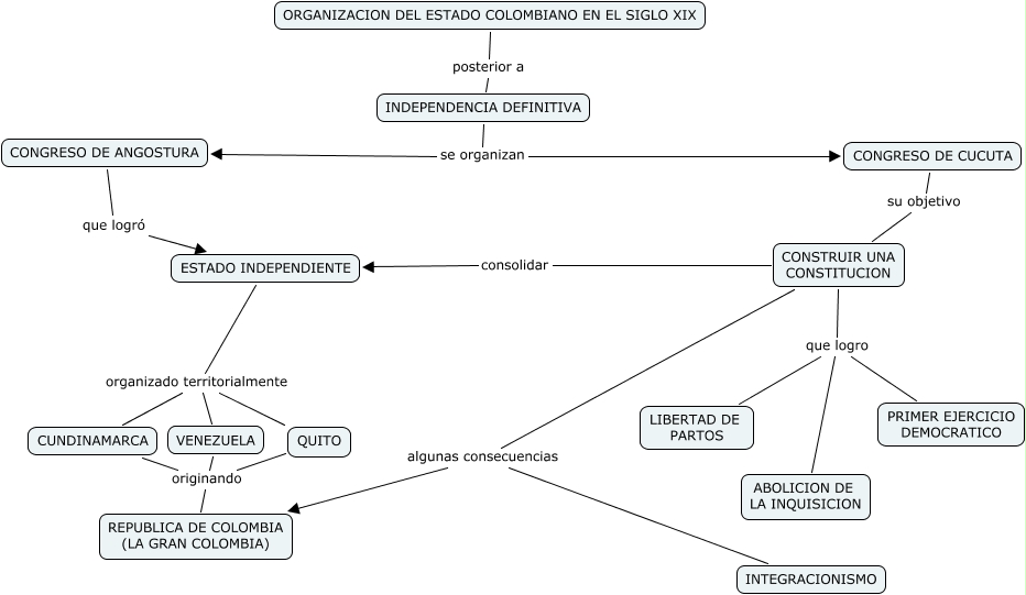 Este Cmap, tiene información relacionada con: Organización del Estado Colombiano siglo XIX, INDEPENDENCIA DEFINITIVA se organizan CONGRESO DE CUCUTA, INDEPENDENCIA DEFINITIVA se organizan CONGRESO DE ANGOSTURA, ORGANIZACION DEL ESTADO COLOMBIANO EN EL SIGLO XIX posterior a INDEPENDENCIA DEFINITIVA, QUITO originando REPUBLICA DE COLOMBIA (LA GRAN COLOMBIA), CONSTRUIR UNA CONSTITUCION algunas consecuencias REPUBLICA DE COLOMBIA (LA GRAN COLOMBIA), CUNDINAMARCA originando REPUBLICA DE COLOMBIA (LA GRAN COLOMBIA), CONSTRUIR UNA CONSTITUCION consolidar ESTADO INDEPENDIENTE, CONGRESO DE ANGOSTURA que logró ESTADO INDEPENDIENTE, ESTADO INDEPENDIENTE organizado territorialmente VENEZUELA, ESTADO INDEPENDIENTE organizado territorialmente QUITO, VENEZUELA originando REPUBLICA DE COLOMBIA (LA GRAN COLOMBIA), CONSTRUIR UNA CONSTITUCION que logro ABOLICION DE LA INQUISICION, CONSTRUIR UNA CONSTITUCION que logro LIBERTAD DE PARTOS, ESTADO INDEPENDIENTE organizado territorialmente CUNDINAMARCA, CONSTRUIR UNA CONSTITUCION que logro PRIMER EJERCICIO DEMOCRATICO, CONGRESO DE CUCUTA su objetivo CONSTRUIR UNA CONSTITUCION, CONSTRUIR UNA CONSTITUCION algunas consecuencias INTEGRACIONISMO