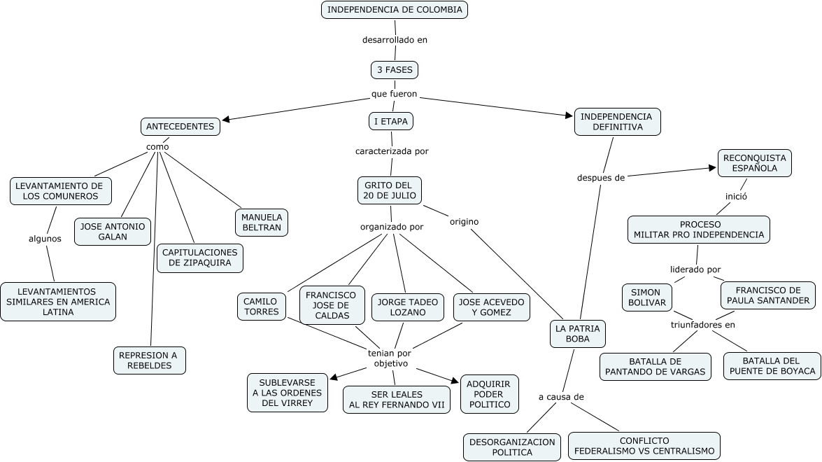 Este Cmap, tiene información relacionada con: INDEPENDENCIA DE COLOMBIA, 3 FASES que fueron I ETAPA, ANTECEDENTES como JOSE ANTONIO GALAN, I ETAPA caracterizada por GRITO DEL 20 DE JULIO, 3 FASES que fueron ANTECEDENTES, LA PATRIA BOBA a causa de CONFLICTO FEDERALISMO VS CENTRALISMO, LEVANTAMIENTO DE LOS COMUNEROS algunos LEVANTAMIENTOS SIMILARES EN AMERICA LATINA, JORGE TADEO LOZANO tenian por objetivo ADQUIRIR PODER POLITICO, INDEPENDENCIA DEFINITIVA despues de LA PATRIA BOBA, ANTECEDENTES como REPRESION A REBELDES, SIMON BOLIVAR triunfadores en BATALLA DE PANTANDO DE VARGAS, FRANCISCO DE PAULA SANTANDER triunfadores en BATALLA DE PANTANDO DE VARGAS, FRANCISCO JOSE DE CALDAS tenian por objetivo SER LEALES AL REY FERNANDO VII, GRITO DEL 20 DE JULIO organizado por JORGE TADEO LOZANO, FRANCISCO DE PAULA SANTANDER triunfadores en BATALLA DEL PUENTE DE BOYACA, JOSE ACEVEDO Y GOMEZ tenian por objetivo SUBLEVARSE A LAS ORDENES DEL VIRREY, FRANCISCO JOSE DE CALDAS tenian por objetivo SUBLEVARSE A LAS ORDENES DEL VIRREY, PROCESO MILITAR PRO INDEPENDENCIA liderado por FRANCISCO DE PAULA SANTANDER, JOSE ACEVEDO Y GOMEZ tenian por objetivo ADQUIRIR PODER POLITICO, GRITO DEL 20 DE JULIO organizado por FRANCISCO JOSE DE CALDAS, FRANCISCO JOSE DE CALDAS tenian por objetivo ADQUIRIR PODER POLITICO