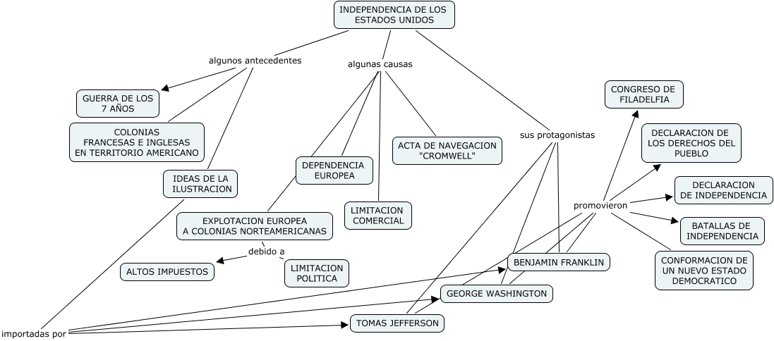 Este Cmap, tiene información relacionada con: Independencia de los Estados Unidos, GEORGE WASHINGTON promovieron DECLARACION DE LOS DERECHOS DEL PUEBLO, INDEPENDENCIA DE LOS ESTADOS UNIDOS algunos antecedentes IDEAS DE LA ILUSTRACION, INDEPENDENCIA DE LOS ESTADOS UNIDOS algunos antecedentes COLONIAS FRANCESAS E INGLESAS EN TERRITORIO AMERICANO, TOMAS JEFFERSON promovieron DECLARACION DE LOS DERECHOS DEL PUEBLO, INDEPENDENCIA DE LOS ESTADOS UNIDOS algunas causas ACTA DE NAVEGACION "CROMWELL", TOMAS JEFFERSON promovieron CONFORMACION DE UN NUEVO ESTADO DEMOCRATICO, BENJAMIN FRANKLIN promovieron DECLARACION DE INDEPENDENCIA, GEORGE WASHINGTON promovieron DECLARACION DE INDEPENDENCIA, INDEPENDENCIA DE LOS ESTADOS UNIDOS sus protagonistas BENJAMIN FRANKLIN, GEORGE WASHINGTON promovieron CONGRESO DE FILADELFIA, EXPLOTACION EUROPEA A COLONIAS NORTEAMERICANAS debido a ALTOS IMPUESTOS, INDEPENDENCIA DE LOS ESTADOS UNIDOS algunas causas EXPLOTACION EUROPEA A COLONIAS NORTEAMERICANAS, IDEAS DE LA ILUSTRACION importadas por GEORGE WASHINGTON, GEORGE WASHINGTON promovieron CONFORMACION DE UN NUEVO ESTADO DEMOCRATICO, EXPLOTACION EUROPEA A COLONIAS NORTEAMERICANAS debido a LIMITACION POLITICA, BENJAMIN FRANKLIN promovieron CONFORMACION DE UN NUEVO ESTADO DEMOCRATICO, BENJAMIN FRANKLIN promovieron CONGRESO DE FILADELFIA, BENJAMIN FRANKLIN promovieron DECLARACION DE LOS DERECHOS DEL PUEBLO, INDEPENDENCIA DE LOS ESTADOS UNIDOS algunas causas DEPENDENCIA EUROPEA, IDEAS DE LA ILUSTRACION importadas por BENJAMIN FRANKLIN
