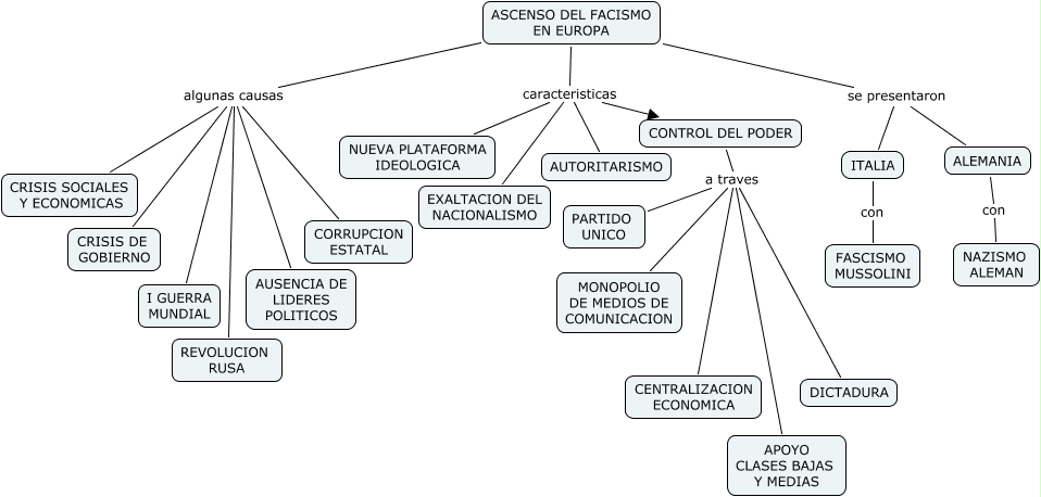 Este Cmap, tiene información relacionada con: Ascenso de los Fascismos en Europa, CONTROL DEL PODER a traves CENTRALIZACION ECONOMICA, ASCENSO DEL FACISMO EN EUROPA algunas causas REVOLUCION RUSA, ASCENSO DEL FACISMO EN EUROPA algunas causas CRISIS DE GOBIERNO, ASCENSO DEL FACISMO EN EUROPA caracteristicas AUTORITARISMO, CONTROL DEL PODER a traves MONOPOLIO DE MEDIOS DE COMUNICACION, ASCENSO DEL FACISMO EN EUROPA se presentaron ITALIA, ASCENSO DEL FACISMO EN EUROPA caracteristicas CONTROL DEL PODER, ASCENSO DEL FACISMO EN EUROPA caracteristicas NUEVA PLATAFORMA IDEOLOGICA, ASCENSO DEL FACISMO EN EUROPA se presentaron ALEMANIA, ASCENSO DEL FACISMO EN EUROPA algunas causas CRISIS SOCIALES Y ECONOMICAS, ITALIA con FASCISMO MUSSOLINI, ASCENSO DEL FACISMO EN EUROPA algunas causas I GUERRA MUNDIAL, ASCENSO DEL FACISMO EN EUROPA algunas causas AUSENCIA DE LIDERES POLITICOS, ALEMANIA con NAZISMO ALEMAN, CONTROL DEL PODER a traves APOYO CLASES BAJAS Y MEDIAS, ASCENSO DEL FACISMO EN EUROPA algunas causas CORRUPCION ESTATAL, ASCENSO DEL FACISMO EN EUROPA caracteristicas EXALTACION DEL NACIONALISMO, CONTROL DEL PODER a traves PARTIDO UNICO, CONTROL DEL PODER a traves DICTADURA