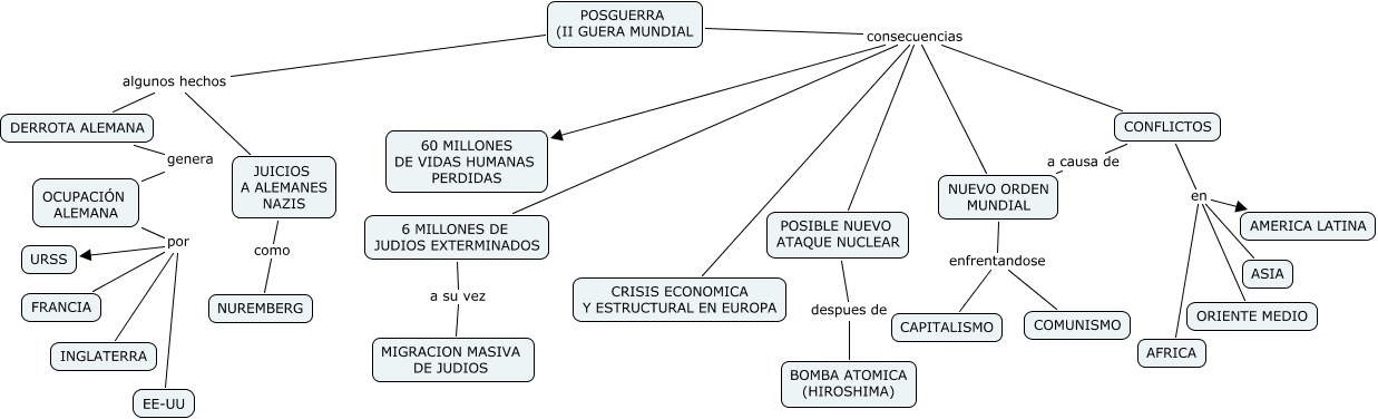 Este Cmap, tiene información relacionada con: Posguerra (II guerra mundial), POSGUERRA (II GUERA MUNDIAL consecuencias NUEVO ORDEN MUNDIAL, OCUPACIÓN ALEMANA por FRANCIA, OCUPACIÓN ALEMANA por INGLATERRA, OCUPACIÓN ALEMANA por EE-UU, POSGUERRA (II GUERA MUNDIAL consecuencias POSIBLE NUEVO ATAQUE NUCLEAR, CONFLICTOS en ASIA, POSIBLE NUEVO ATAQUE NUCLEAR despues de BOMBA ATOMICA (HIROSHIMA), POSGUERRA (II GUERA MUNDIAL algunos hechos JUICIOS A ALEMANES NAZIS, POSGUERRA (II GUERA MUNDIAL algunos hechos DERROTA ALEMANA, CONFLICTOS en AMERICA LATINA, JUICIOS A ALEMANES NAZIS como NUREMBERG, DERROTA ALEMANA genera OCUPACIÓN ALEMANA, CONFLICTOS en ORIENTE MEDIO, NUEVO ORDEN MUNDIAL enfrentandose COMUNISMO, POSGUERRA (II GUERA MUNDIAL consecuencias CRISIS ECONOMICA Y ESTRUCTURAL EN EUROPA, POSGUERRA (II GUERA MUNDIAL consecuencias 60 MILLONES DE VIDAS HUMANAS PERDIDAS, POSGUERRA (II GUERA MUNDIAL consecuencias 6 MILLONES DE JUDIOS EXTERMINADOS, CONFLICTOS a causa de NUEVO ORDEN MUNDIAL, CONFLICTOS en AFRICA, 6 MILLONES DE JUDIOS EXTERMINADOS a su vez MIGRACION MASIVA DE JUDIOS