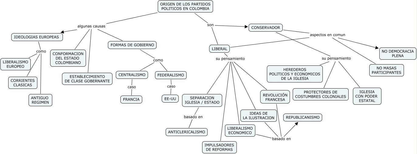 Este Cmap, tiene información relacionada con: origen de los partidos politicos en Colombia, FORMAS DE GOBIERNO como FEDERALISMO, ORIGEN DE LOS PARTIDOS POLITICOS EN COLOMBIA algunas causas FORMAS DE GOBIERNO, IDEAS DE LA ILUSTRACION basado en REPUBLICANISMO, IDEOLOGIAS EUROPEAS como ANTIGUO REGIMEN, LIBERAL su pensamiento IDEAS DE LA ILUSTRACION, LIBERAL su pensamiento IMPULSADORES DE REFORMAS, ORIGEN DE LOS PARTIDOS POLITICOS EN COLOMBIA algunas causas CONFORMACION DEL ESTADO COLOMBIANO, ORIGEN DE LOS PARTIDOS POLITICOS EN COLOMBIA son LIBERAL, CONSERVADOR su pensamiento IGLESIA CON PODER ESTATAL, IDEOLOGIAS EUROPEAS como LIBERALISMO EUROPEO, LIBERAL aspectos en comun NO DEMOCRACIA PLENA, LIBERAL su pensamiento SEPARACION IGLESIA / ESTADO, LIBERAL aspectos en comun NO MASAS PARTICIPANTES, CONSERVADOR su pensamiento PROTECTORES DE COSTUMBRES COLONIALES, CENTRALISMO caso FRANCIA, ORIGEN DE LOS PARTIDOS POLITICOS EN COLOMBIA son CONSERVADOR, LIBERALISMO ECONOMICO basado en REPUBLICANISMO, CONSERVADOR su pensamiento HEREDEROS POLITICOS Y ECONOMICOS DE LA IGLESIA, LIBERAL su pensamiento REVOLUCIÓN FRANCESA, REVOLUCIÓN FRANCESA basado en REPUBLICANISMO