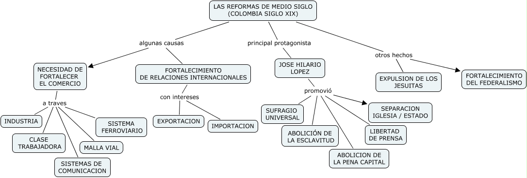 Este Cmap, tiene información relacionada con: REFORMAS DE SIGLO XIX EN COLOMBIA, JOSE HILARIO LOPEZ promovió ABOLICIÓN DE LA ESCLAVITUD, NECESIDAD DE FORTALECER EL COMERCIO a traves MALLA VIAL, LAS REFORMAS DE MEDIO SIGLO (COLOMBIA SIGLO XIX) otros hechos EXPULSION DE LOS JESUITAS, NECESIDAD DE FORTALECER EL COMERCIO a traves CLASE TRABAJADORA, NECESIDAD DE FORTALECER EL COMERCIO a traves SISTEMAS DE COMUNICACION, FORTALECIMIENTO DE RELACIONES INTERNACIONALES con intereses IMPORTACION, JOSE HILARIO LOPEZ promovió SUFRAGIO UNIVERSAL, JOSE HILARIO LOPEZ promovió SEPARACION IGLESIA / ESTADO, NECESIDAD DE FORTALECER EL COMERCIO a traves INDUSTRIA, JOSE HILARIO LOPEZ promovió ABOLICION DE LA PENA CAPITAL, FORTALECIMIENTO DE RELACIONES INTERNACIONALES con intereses EXPORTACION, NECESIDAD DE FORTALECER EL COMERCIO a traves SISTEMA FERROVIARIO, LAS REFORMAS DE MEDIO SIGLO (COLOMBIA SIGLO XIX) algunas causas NECESIDAD DE FORTALECER EL COMERCIO, LAS REFORMAS DE MEDIO SIGLO (COLOMBIA SIGLO XIX) principal protagonista JOSE HILARIO LOPEZ, LAS REFORMAS DE MEDIO SIGLO (COLOMBIA SIGLO XIX) otros hechos FORTALECIMIENTO DEL FEDERALISMO, JOSE HILARIO LOPEZ promovió LIBERTAD DE PRENSA, LAS REFORMAS DE MEDIO SIGLO (COLOMBIA SIGLO XIX) algunas causas FORTALECIMIENTO DE RELACIONES INTERNACIONALES