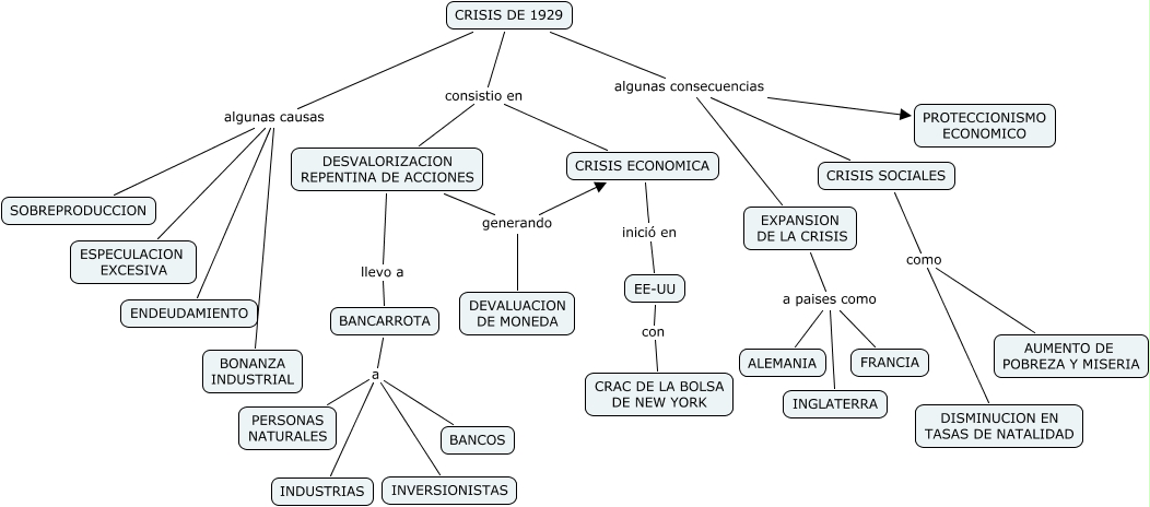 Este Cmap, tiene información relacionada con: CRISIS DE 1929, EE-UU con CRAC DE LA BOLSA DE NEW YORK, CRISIS DE 1929 algunas causas BONANZA INDUSTRIAL, CRISIS SOCIALES como DISMINUCION EN TASAS DE NATALIDAD, DESVALORIZACION REPENTINA DE ACCIONES generando CRISIS ECONOMICA, BANCARROTA a INDUSTRIAS, CRISIS SOCIALES como AUMENTO DE POBREZA Y MISERIA, DESVALORIZACION REPENTINA DE ACCIONES llevo a BANCARROTA, CRISIS ECONOMICA inició en EE-UU, CRISIS DE 1929 consistio en DESVALORIZACION REPENTINA DE ACCIONES, CRISIS DE 1929 algunas causas SOBREPRODUCCION, CRISIS DE 1929 algunas consecuencias CRISIS SOCIALES, CRISIS DE 1929 algunas causas ENDEUDAMIENTO, CRISIS DE 1929 algunas causas ESPECULACION EXCESIVA, BANCARROTA a PERSONAS NATURALES, DESVALORIZACION REPENTINA DE ACCIONES generando DEVALUACION DE MONEDA, EXPANSION DE LA CRISIS a paises como INGLATERRA, BANCARROTA a INVERSIONISTAS, CRISIS DE 1929 algunas consecuencias PROTECCIONISMO ECONOMICO, BANCARROTA a BANCOS, CRISIS DE 1929 consistio en CRISIS ECONOMICA
