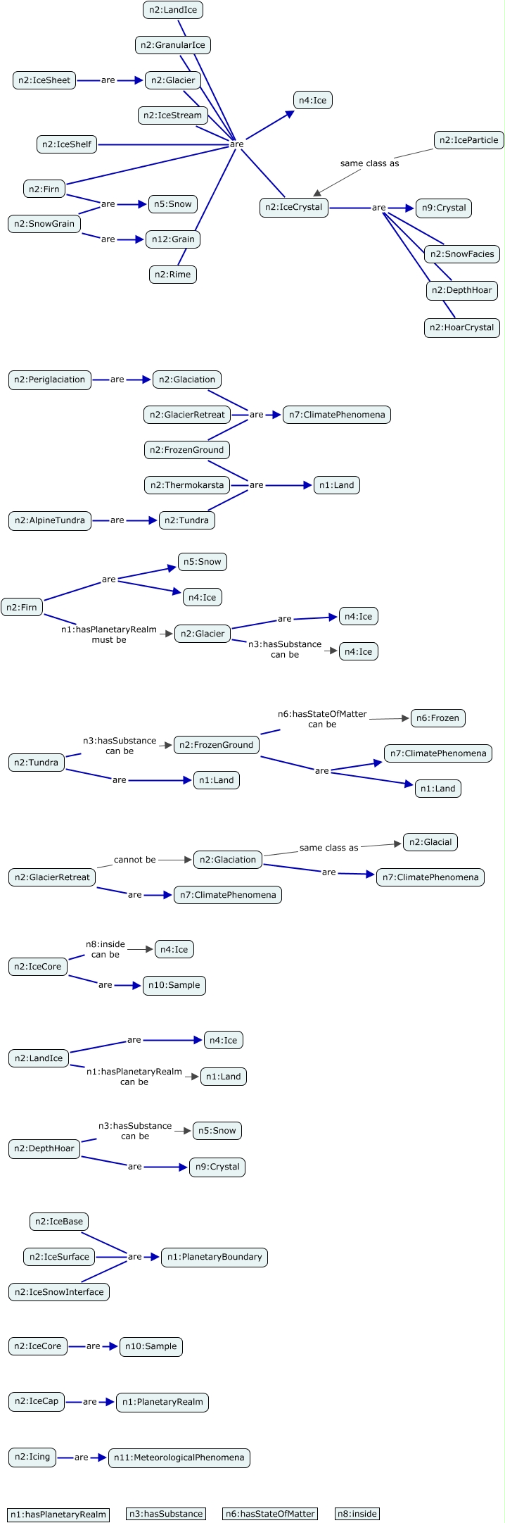 This Concept Map, created with IHMC CmapTools, has information related to: cryo, n2:IceParticle same class as n2:IceCrystal, n2:DepthHoar are n9:Crystal, n2:Firn n1:hasPlanetaryRealm must be n2:Glacier, n2:SnowFacies are n9:Crystal, n2:GlacierRetreat cannot be n2:Glaciation, n2:Firn are n5:Snow, n2:Rime are n4:Ice, n2:Glacier are n4:Ice, n2:IceCore are n10:Sample, n2:Tundra n3:hasSubstance can be n2:FrozenGround, n2:IceSheet are n2:Glacier, n2:Thermokarsta are n1:Land, n2:IceCrystal are n4:Ice, n2:Glaciation are n7:ClimatePhenomena, n2:Periglaciation are n2:Glaciation, n2:Glaciation same class as n2:Glacial, n2:FrozenGround are n7:ClimatePhenomena, n2:IceShelf are n4:Ice, n2:FrozenGround n6:hasStateOfMatter can be n6:Frozen, n2:Firn are n5:Snow