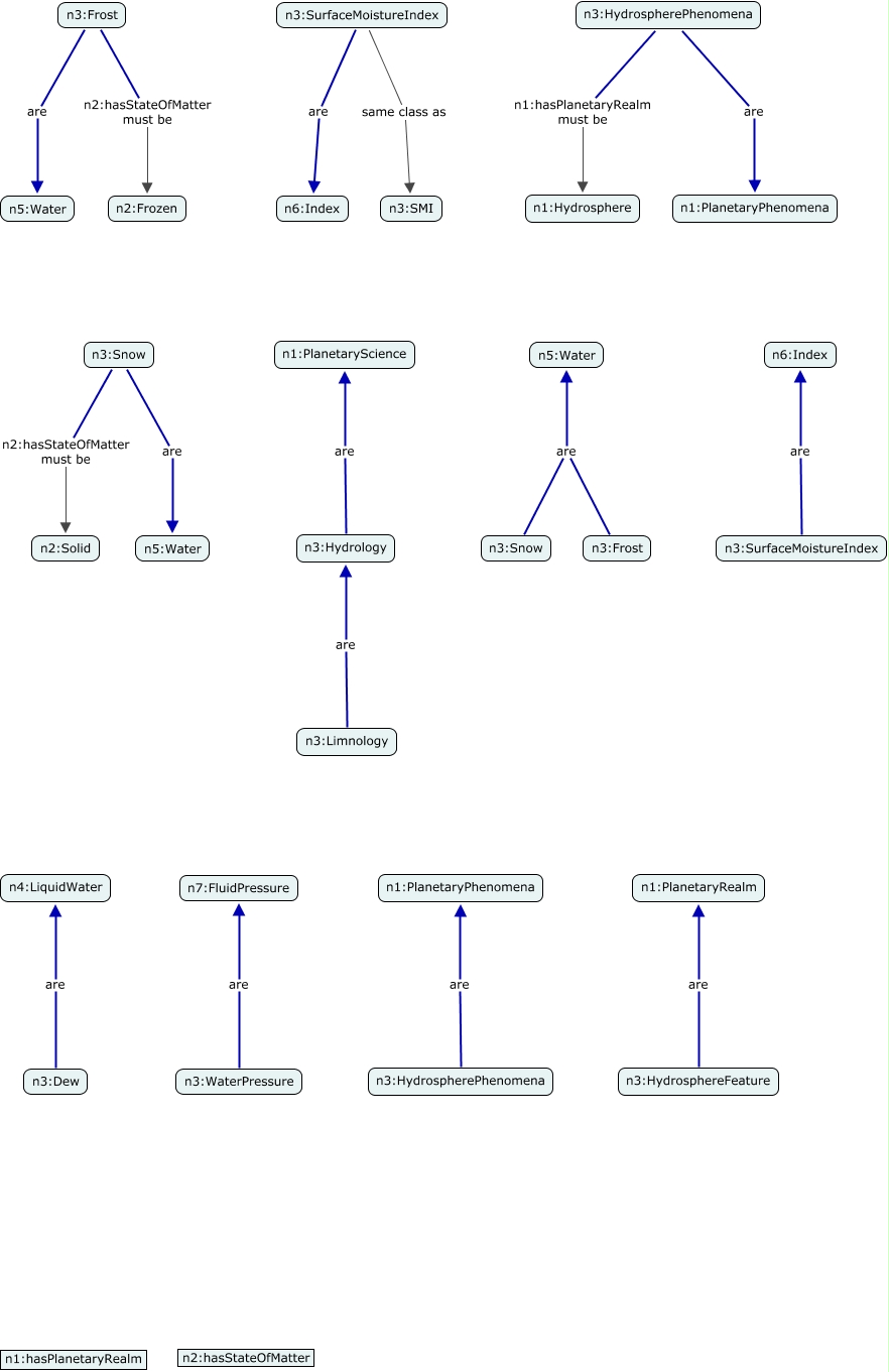 This Concept Map, created with IHMC CmapTools, has information related to: hydro, n3:Snow are n5:Water, n3:Snow n2:hasStateOfMatter must be n2:Solid, n3:HydrospherePhenomena are n1:PlanetaryPhenomena, n3:HydrospherePhenomena n1:hasPlanetaryRealm must be n1:Hydrosphere, n3:Dew are n4:LiquidWater, n3:Frost n2:hasStateOfMatter must be n2:Frozen, n3:Frost are n5:Water, n3:Snow are n5:Water, n3:Frost are n5:Water, n3:SurfaceMoistureIndex same class as n3:SMI, n3:Hydrology are n1:PlanetaryScience, n3:HydrospherePhenomena are n1:PlanetaryPhenomena, n3:SurfaceMoistureIndex are n6:Index, n3:HydrosphereFeature are n1:PlanetaryRealm, n3:SurfaceMoistureIndex are n6:Index, n3:WaterPressure are n7:FluidPressure, n3:Limnology are n3:Hydrology