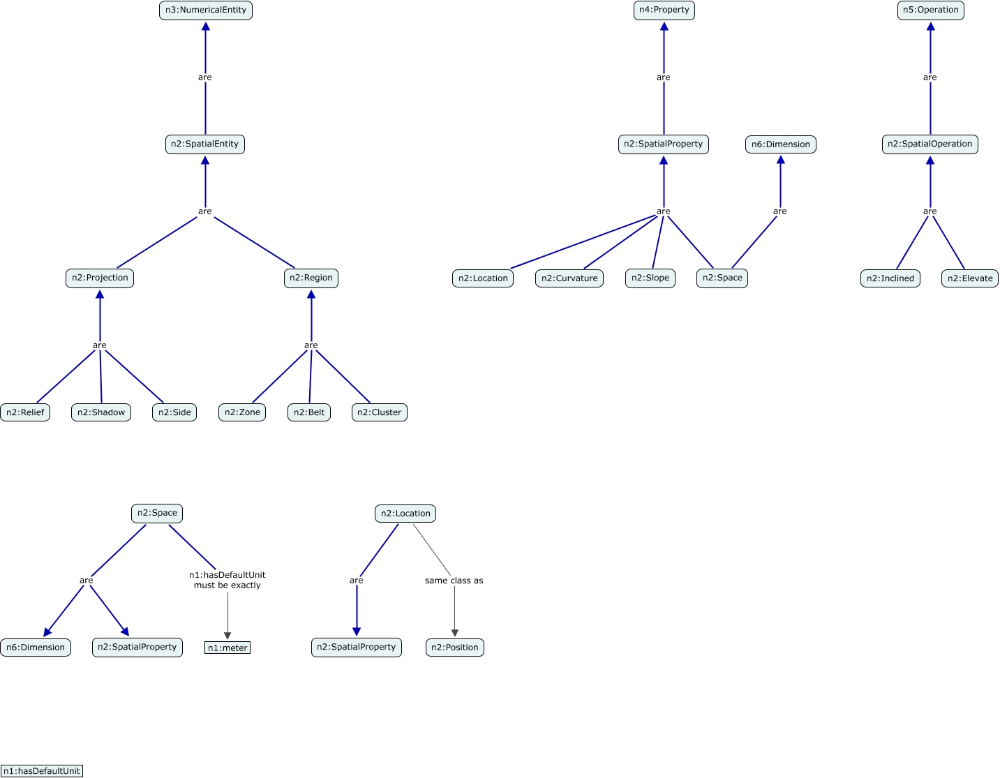 This Concept Map, created with IHMC CmapTools, has information related to: space, n2:Shadow are n2:Projection, n2:SpatialOperation are n5:Operation, n2:Space n1:hasDefaultUnit must be exactly n1:meter, n2:Location are n2:SpatialProperty, n2:Location same class as n2:Position, n2:Side are n2:Projection, n2:Space are n6:Dimension, n2:Projection are n2:SpatialEntity, n2:Belt are n2:Region, n2:Region are n2:SpatialEntity, n2:Space are n2:SpatialProperty, n2:Relief are n2:Projection, n2:Cluster are n2:Region, n2:Curvature are n2:SpatialProperty, n2:Space are n2:SpatialProperty, n2:Slope are n2:SpatialProperty, n2:SpatialProperty are n4:Property, n2:Elevate are n2:SpatialOperation, n2:Location are n2:SpatialProperty, n2:Inclined are n2:SpatialOperation