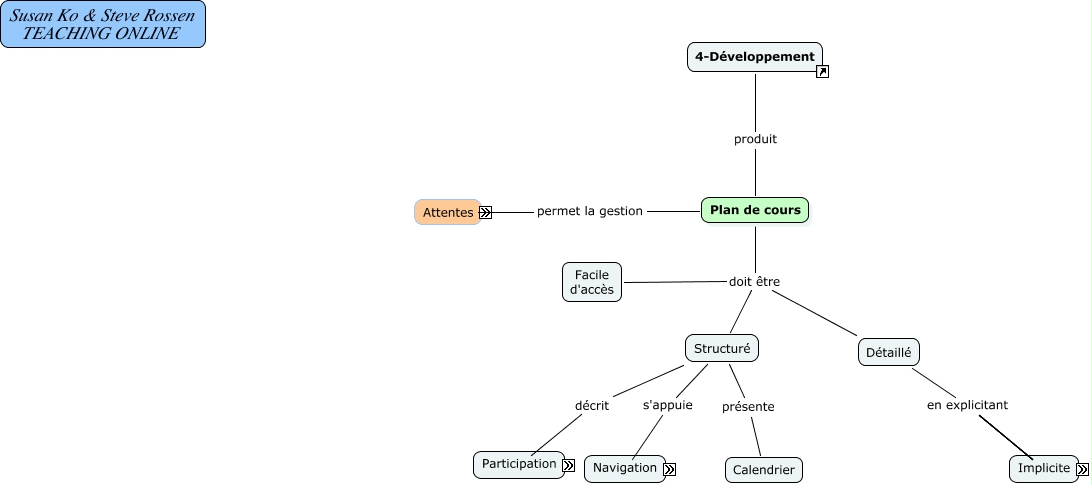 Cette carte de concepts créée avec IHMC CmapTools traite de: Ko_Rossen_Chap5, 4-Développement produit Plan de cours, Besoin de repères accentué par Cours en ligne, Anxieux accentué par Cours en ligne, Plan de cours doit être Facile d'accès, Étudiants ont Besoin de repères, Plan de cours permet la gestion Étudiants, Règles de participation renforcées par Critères d'évaluation, Structuré décrit Règles de participation, Détaillé en explicitant Intentions pédagogiques, Plan de cours doit être Structuré, Étudiants sont Désorientés, Carte de navigation présentant Ressources, Détaillé en explicitant Outils de communication, Étudiants sont Anxieux, Désorientés accentué par Cours en ligne, Détaillé en explicitant Caractéristiques de l'apprentissage en ligne, Plan de cours doit être Détaillé, Détaillé en explicitant Consignes générales, Structuré présente Calendrier, Carte de navigation présentant Codes de navigation