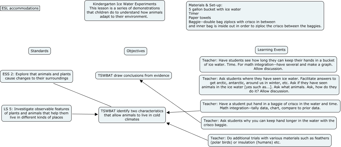 This Concept Map, created with IHMC CmapTools, has information related to: KIceWaterDemos, ESS 2: Explore that animals and plants cause changes to their surroundings TSWBAT identify two characteristics that allow animals to live in cold climates, LS 5: Investigate observable features of plants and animals that help them live in different kinds of places TSWBAT identify two characteristics that allow animals to live in cold climates, Teacher: Ask students why you can keep hand longer in the water with the crisco baggie. TSWBAT draw conclusions from evidence, Teacher: Do additional trials with various materials such as feathers (polar birds) or insulation (humans) etc. TSWBAT identify two characteristics that allow animals to live in cold climates, Teacher: Have a student put hand in a baggie of crisco in the water and time. Math integration--tally data, chart, compare to prior data. TSWBAT identify two characteristics that allow animals to live in cold climates