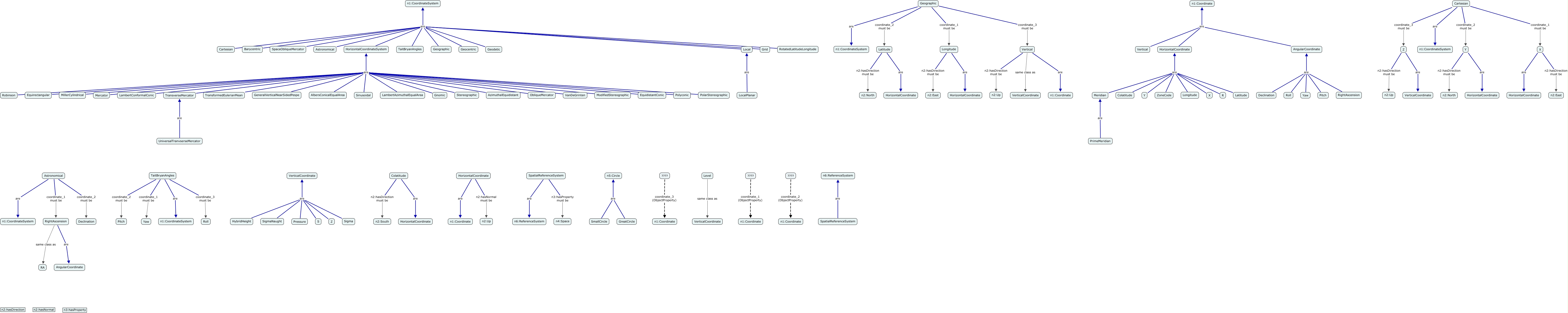 This Concept Map, created with IHMC CmapTools, has information related to: spaceCoordinates, Polyconic are HorizontalCoordinateSystem, Geographic coordinate_2 must be Latitude, RightAscension are AngularCoordinate, RotatedLatitudeLongitude are n1:CoordinateSystem, LambertConformalConic are HorizontalCoordinateSystem, Pressure are VerticalCoordinate, Latitude are HorizontalCoordinate, Vertical are n1:Coordinate, TransverseMercator are HorizontalCoordinateSystem, Yaw are AngularCoordinate, Cartesian are n1:CoordinateSystem, Cartesian coordinate_2 must be Y, Y are HorizontalCoordinate, Declination are AngularCoordinate, Robinson are HorizontalCoordinateSystem, Cartesian are n1:CoordinateSystem, HorizontalCoordinate n2:hasNormal must be n2:Up, Cartesian coordinate_3 must be Z, Z are VerticalCoordinate, HorizontalCoordinateSystem are n1:CoordinateSystem