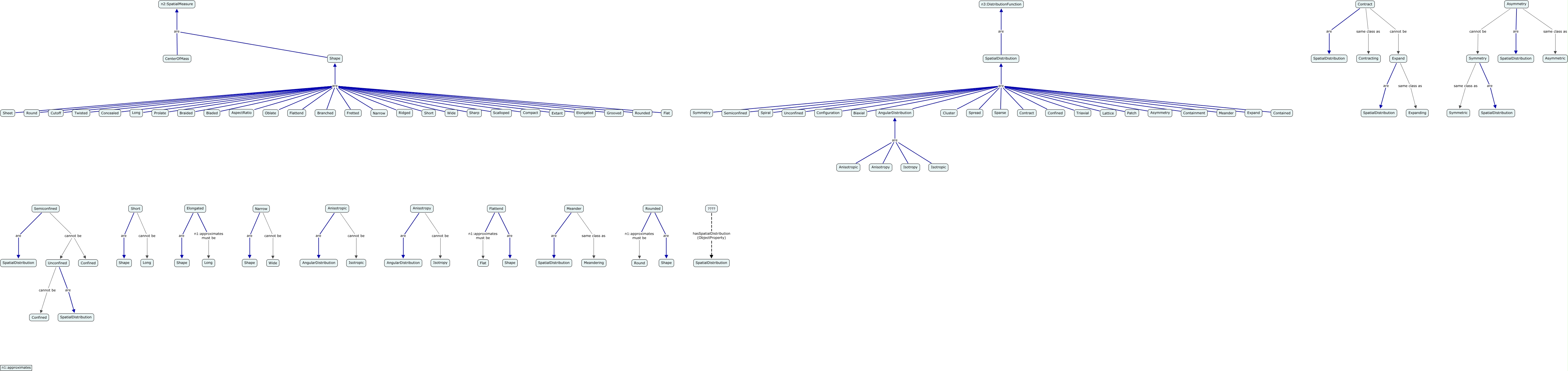 This Concept Map, created with IHMC CmapTools, has information related to: spaceDistribution, Shape are n2:SpatialMeasure, Expand same class as Expanding, Rounded are Shape, Expand are SpatialDistribution, Flattend are Shape, Containment are SpatialDistribution, Meander are SpatialDistribution, Contract cannot be Expand, Elongated n1:approximates must be Long, SpatialDistribution are n3:DistributionFunction, ???? hasSpatialDistribution (ObjectProperty) SpatialDistribution, Confined are SpatialDistribution, Meander are SpatialDistribution, Anisotropic are AngularDistribution, Rounded n1:approximates must be Round, Expand are SpatialDistribution, Narrow are Shape, Meander same class as Meandering, Sharp are Shape, Elongated are Shape