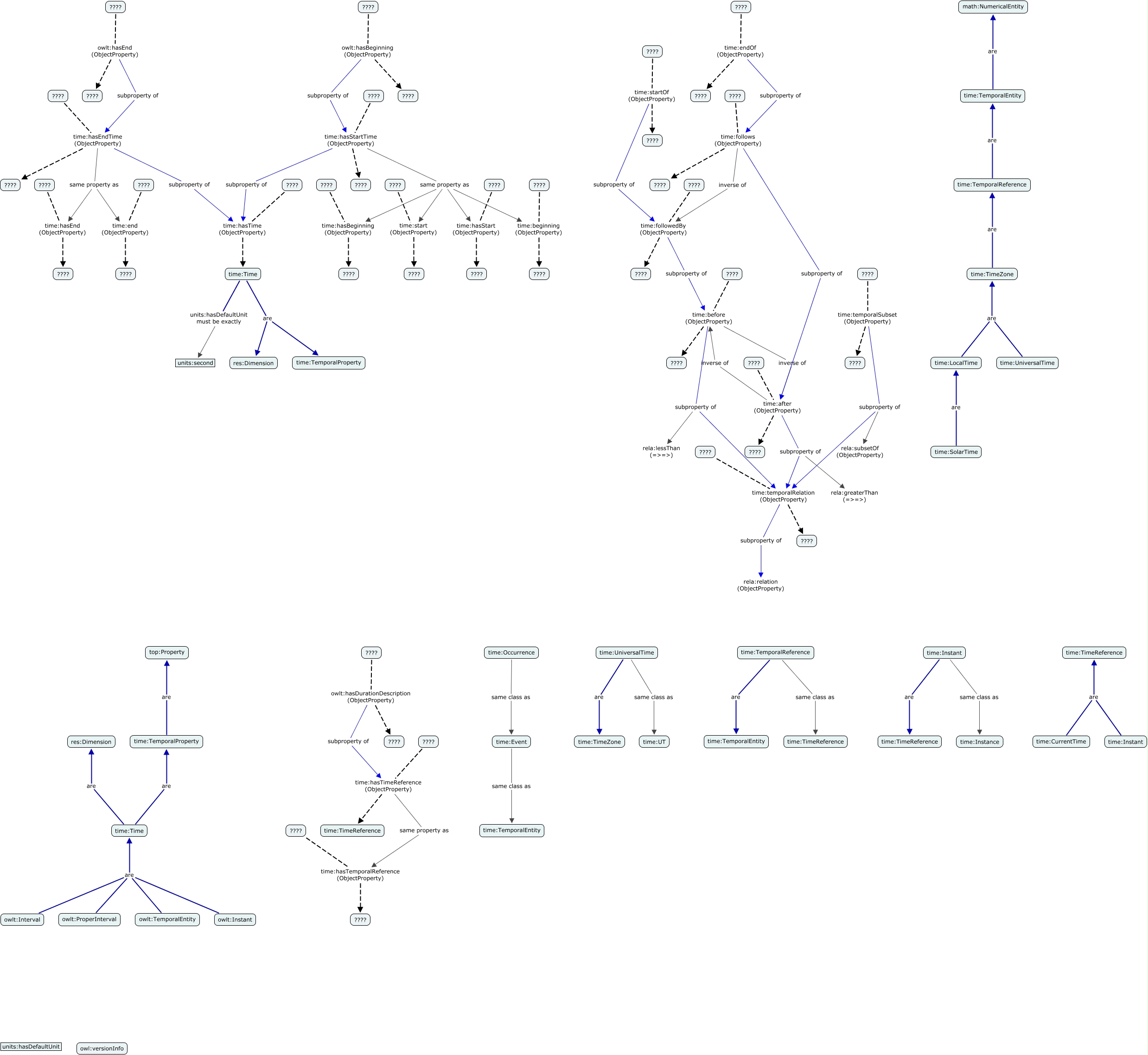 This Concept Map, created with IHMC CmapTools, has information related to: time, time:TemporalReference same class as time:TimeReference, time:TemporalReference are time:TemporalEntity, time:Time units:hasDefaultUnit must be exactly units:second, ???? time:follows (ObjectProperty) inverse of time:followedBy (ObjectProperty) subproperty of time:before (ObjectProperty) inverse of time:after (ObjectProperty) ????, ???? time:follows (ObjectProperty) inverse of time:followedBy (ObjectProperty) subproperty of time:before (ObjectProperty) ????, ???? owlt:hasEnd (ObjectProperty) ????, owlt:TemporalEntity are time:Time, ???? time:endOf (ObjectProperty) subproperty of time:follows (ObjectProperty) subproperty of time:after (ObjectProperty) subproperty of time:temporalRelation (ObjectProperty) ????, ???? time:hasEndTime (ObjectProperty) same property as time:hasEnd (ObjectProperty) ????, time:TimeZone are time:TemporalReference, ???? time:startOf (ObjectProperty) subproperty of time:followedBy (ObjectProperty) subproperty of time:before (ObjectProperty) inverse of time:after (ObjectProperty) ????, ???? time:hasTemporalReference (ObjectProperty) ????, ???? time:hasEndTime (ObjectProperty) subproperty of time:hasTime (ObjectProperty) time:Time, ???? time:startOf (ObjectProperty) subproperty of time:followedBy (ObjectProperty) subproperty of time:before (ObjectProperty) subproperty of time:temporalRelation (ObjectProperty) ????, ???? owlt:hasDurationDescription (ObjectProperty) subproperty of time:hasTimeReference (ObjectProperty) time:TimeReference, ???? time:followedBy (ObjectProperty) subproperty of time:before (ObjectProperty) ????, time:Instant are time:TimeReference, time:Time are res:Dimension, ???? time:follows (ObjectProperty) inverse of time:followedBy (ObjectProperty) subproperty of time:before (ObjectProperty) inverse of time:after (ObjectProperty) subproperty of time:temporalRelation (ObjectProperty) ????, ???? owlt:hasEnd (ObjectProperty) subproperty of time:hasEndTime (ObjectProperty) subproperty of time:hasTime (ObjectProperty) time:Time