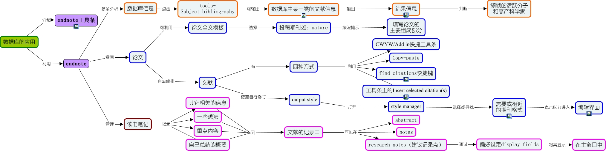 此概念图以 IHMC CmapTools 创建, 内含信息有关于: 数据库的应用, 四种方式 利用 Copy-paste, 四种方式 利用 工具条上的Insert selected citation(s), endnote 撰写 论文, 数据库信息 点击 tools- Subject bibliography, 一些想法 到 文献的记录中, 其它相关的信息 到 文献的记录中, 读书笔记 记录 自己总结的概要, 需要或相近 的期刊格式 点击Edit进入 编辑界面, style manager 选择或寻找 需要或相近 的期刊格式, 文献 有 四种方式, 论文 自动编排 文献, 投稿期刊如:nature 按照提示 填写论文的 主要组成部分, 读书笔记 记录 其它相关的信息, 读书笔记 记录 重点内容, 数据库的应用 介绍 endnote工具条, 论文 可利用 论文全文模板, 重点内容 到 文献的记录中, 文献 依需自行修订 output style, 结果信息 判断 领域的活跃分子 和高产科学家, 论文全文模板 选择 投稿期刊如:nature