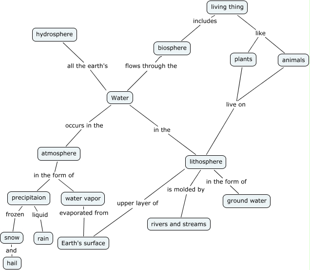 This Concept Map, created with IHMC CmapTools, has information related to: Hammell- Earth's four spheres, atmosphere in the form of precipitaion, lithosphere in the form of ground water, biosphere includes living thing, hydrosphere all the earth's Water, living thing like animals, snow and hail, precipitaion frozen snow, animals live on lithosphere, lithosphere is molded by rivers and streams, Earth's surface upper layer of lithosphere, Water in the lithosphere, water vapor evaporated from Earth's surface, plants live on lithosphere, precipitaion liquid rain, atmosphere in the form of water vapor, biosphere flows through the Water, living thing like plants, Water occurs in the atmosphere