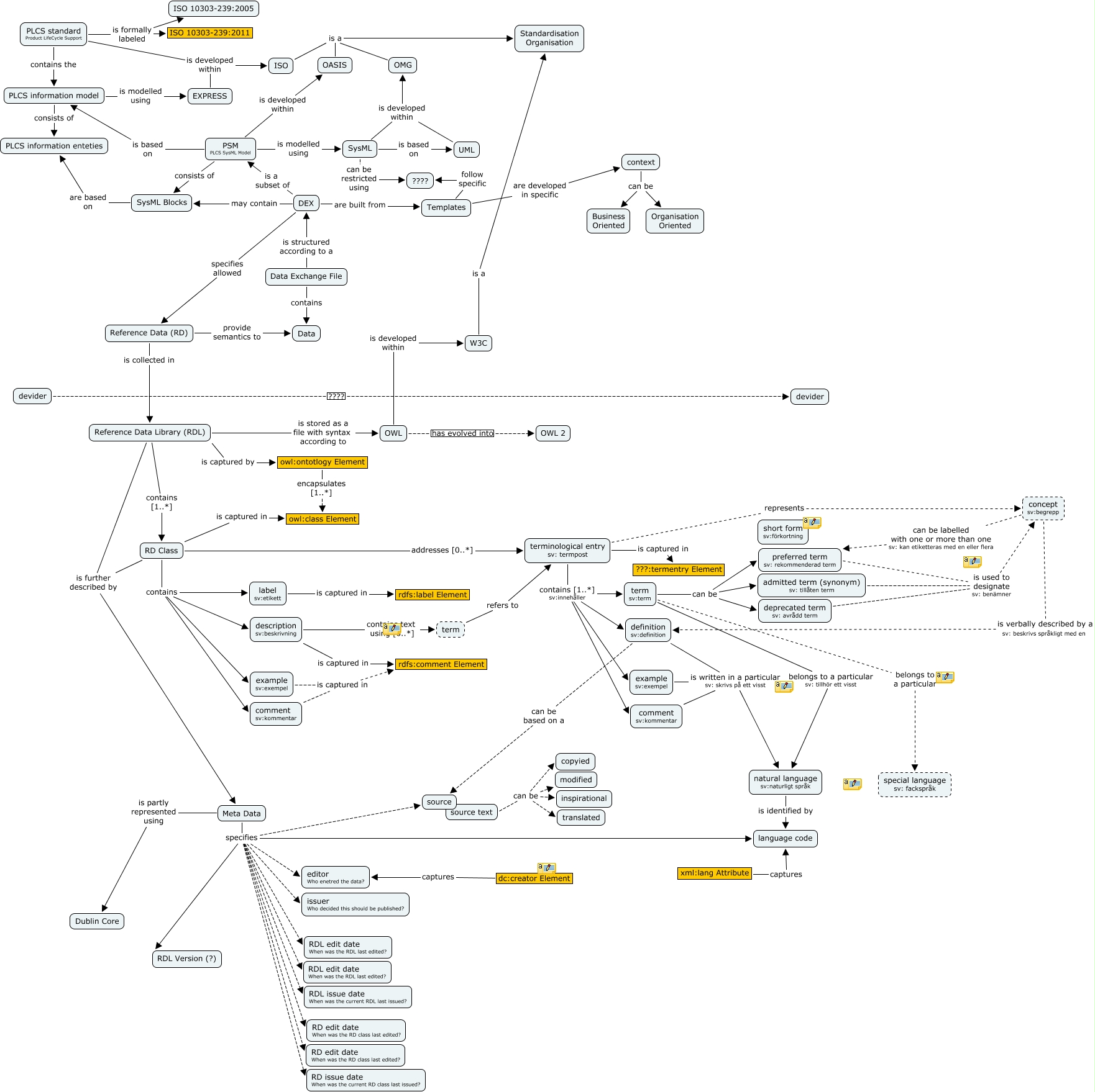 Den här kartan innehåller information om: PLCS RD terminology-3-FMV, OWL has evolved into OWL 2, Data Exchange File contains Data, concept sv:begrepp can be labelled with one or more than one sv: kan etiketteras med en eller flera preferred term sv: rekommenderad term, term sv:term belongs to a particular sv: tillhör ett visst natural language sv:naturligt språk, term refers to terminological entry sv: termpost, Meta Data specifies issuer Who decided this should be published?, terminological entry sv: termpost contains [1..*] sv:innehåller comment sv:kommentar, PLCS standard Product LifeCycle Support is formally labeled ISO 10303-239:2005, DEX specifies allowed Reference Data (RD), Meta Data specifies editor Who enetred the data?, PLCS information model is modelled using EXPRESS, DEX may contain SysML Blocks, terminological entry sv: termpost represents concept sv:begrepp, RD Class contains comment sv:kommentar, source text can be inspirational, Templates follow specific ????, PSM PLCS SysML Model is developed within OASIS, PSM PLCS SysML Model is based on PLCS information model, terminological entry sv: termpost contains [1..*] sv:innehåller definition sv:definition, xml:lang Attribute captures language code