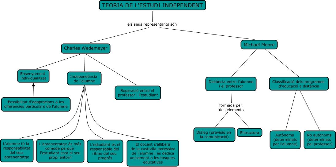 Aquest mapa conceptual conté informació relacionada amb: 1) Teories de l'Educacio - T. Estudi Independent, Independència de l'alumne ???? L'alumne té la responsabilitat del seu aprenentatge, Michael Moore ???? Distància entre l'alumne i el professor, Independència de l'alumne ???? L'estudiant és el responsable del ritme del seu progrés, Distància entre l'alumne i el professor formada per dos elements Estructura, Ensenyament individualitzat ???? Independència de l'alumne, Possibilitat d'adaptacions a les diferències particulars de l'alumne ???? Ensenyament individualitzat, Independència de l'alumne ???? L'aprenentatge és més còmode perquè l'estudiant està al seu propi entorn, Michael Moore ???? Classificació dels programes d'educació a distància, Classificació dels programes d'educació a distància Autònoms (determinats per l'alumne), Classificació dels programes d'educació a distància No autònoms (determinats pel professor), TEORIA DE L'ESTUDI INDEPENDENT els seus representants són Charles Wedemeyer, Ensenyament individualitzat ???? Separació entre el professor i l'estudiant, TEORIA DE L'ESTUDI INDEPENDENT els seus representants són Michael Moore, Independència de l'alumne ???? El docent s'allibera de la custodia excessiva de l'alumne i es dedica unicament a les tasques educatives, Ensenyament individualitzat ???? Charles Wedemeyer, Distància entre l'alumne i el professor formada per dos elements Diàleg (previsió en la comunicació)