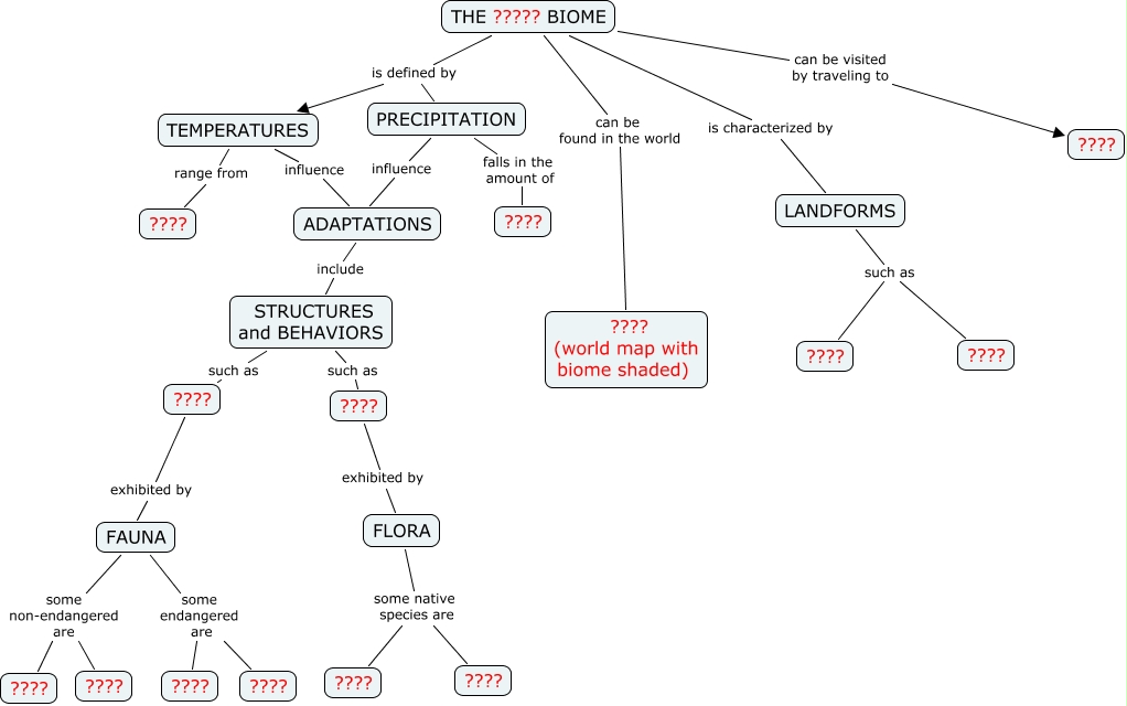 This Concept Map, created with IHMC CmapTools, has information related to: biome template, STRUCTURES and BEHAVIORS such as ????, STRUCTURES and BEHAVIORS such as ????, LANDFORMS such as ????, TEMPERATURES range from ????, FLORA some native species are ????, FLORA some native species are ????, THE ????? BIOME is defined by TEMPERATURES, THE ????? BIOME can be found in the world ???? (world map with biome shaded), THE ????? BIOME is characterized by LANDFORMS, THE ????? BIOME is defined by PRECIPITATION, TEMPERATURES influence ADAPTATIONS, ???? exhibited by FLORA, ADAPTATIONS include STRUCTURES and BEHAVIORS, FAUNA some non-endangered are ????, PRECIPITATION influence ADAPTATIONS, FAUNA some endangered are ????, PRECIPITATION falls in the amount of ????, THE ????? BIOME can be visited by traveling to ????, FAUNA some endangered are ????, ???? exhibited by FAUNA