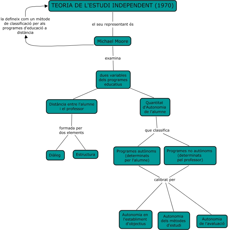 Aquest mapa conceptual conté informació relacionada amb: 2) Teories de l'Educacio - T. Estudi Independent (Michael Moore), dues variables dels programes educatius ???? Quantitat d'Autonomia de l'alumne, Quantitat d'Autonomia de l'alumne que classifica Programes autònoms (determinats per l'alumne), Programes autònoms (determinats per l'alumne) calibrat per Autonomia en l'establiment d'objectius, Michael Moore la defineix com un mètode de classificació per als programes d'educació a distància TEORIA DE L'ESTUDI INDEPENDENT (1970), Programes autònoms (determinats per l'alumne) calibrat per Autonomia dels mètodes d'estudi, TEORIA DE L'ESTUDI INDEPENDENT (1970) el seu representant és Michael Moore, Programes autònoms (determinats per l'alumne) calibrat per Programes no autònoms (determinats pel professor), Quantitat d'Autonomia de l'alumne que classifica Programes no autònoms (determinats pel professor), Distància entre l'alumne i el professor formada per dos elements Estructura, Michael Moore examina dues variables dels programes educatius, Programes autònoms (determinats per l'alumne) calibrat per Autonomia de l'avaluació, dues variables dels programes educatius ???? Distància entre l'alumne i el professor, Distància entre l'alumne i el professor formada per dos elements Diàleg
