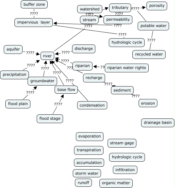 This Concept Map, created with IHMC CmapTools, has information related to: Blaiz Murray, sediment ???? erosion, potable water ???? recycled water, riparian ???? river, tributary ???? permeability, flood stage ???? base flow, flood plain ???? groundwater, riparian water rights ???? riparian, aquifer ???? river, groundwater ???? river, base flow ???? river, recharge ???? river, discharge ???? river, recharge ???? sediment, permeability ???? impervious layer, buffer zone ???? impervious layer, watershed ???? tributary, impervious layer ???? hydrologic cycle, tributary ???? potable water, condensation ???? river, tributary ???? porosity