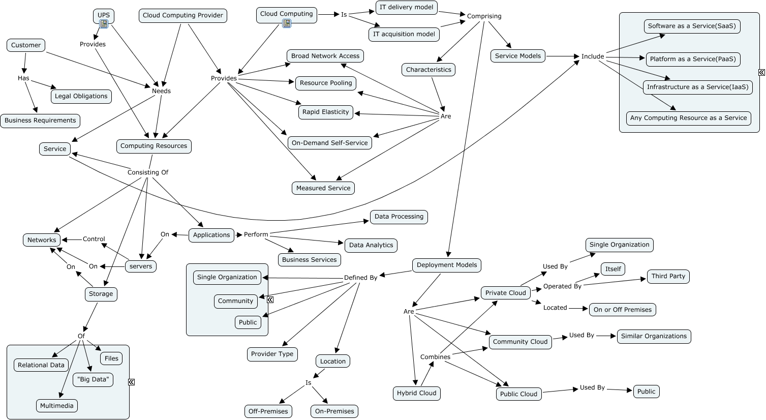 This Concept Map, created with IHMC CmapTools, has information related to: CloudComputingModel_version01, Cloud Computing Provider Needs Computing Resources, Computing Resources Consisting Of Applications, Deployment Models Are Hybrid Cloud, servers On Networks, Deployment Models Defined By Community, Cloud Computing Provider Needs Service, Computing Resources Consisting Of Storage, Cloud Computing Is IT delivery model, Applications Perform Data Analytics, Storage Of Multimedia, Cloud Computing Provides Rapid Elasticity, Characteristics Are Rapid Elasticity, Private Cloud Operated By Third Party, Characteristics Are Measured Service, Deployment Models Defined By Provider Type, Deployment Models Defined By Single Organization, IT delivery model Comprising Characteristics, Storage Of Relational Data, Storage Of "Big Data", Private Cloud Operated By Itself