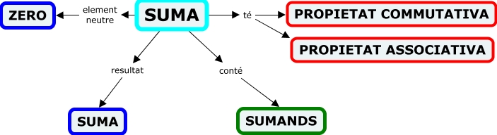 Aquest mapa conceptual conté informació relacionada amb: Suma, SUMA té PROPIETAT COMMUTATIVA, SUMA element neutre ZERO, SUMA conté SUMANDS, SUMA resultat SUMA, SUMA té PROPIETAT ASSOCIATIVA