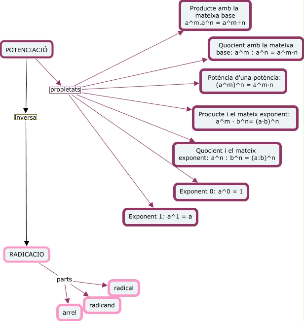 Aquest mapa conceptual conté informació relacionada amb: potenciacio, POTENCIACIÓ propietats Exponent 0: a^0 = 1, POTENCIACIÓ propietats Exponent 1: a^1 = a, POTENCIACIÓ propietats Quocient amb la mateixa base: a^m : a^n = a^m-n, POTENCIACIÓ propietats Potència d'una potència: (a^m)^n = a^m·n, RADICACIO parts radical, POTENCIACIÓ propietats Producte i el mateix exponent: a^m · b^n= (a·b)^n, POTENCIACIÓ propietats Quocient i el mateix exponent: a^n : b^n = (a:b)^n, POTENCIACIÓ propietats Producte amb la mateixa base a^m.a^n = a^m+n, RADICACIO parts arrel, RADICACIO parts radicand, POTENCIACIÓ inversa RADICACIO