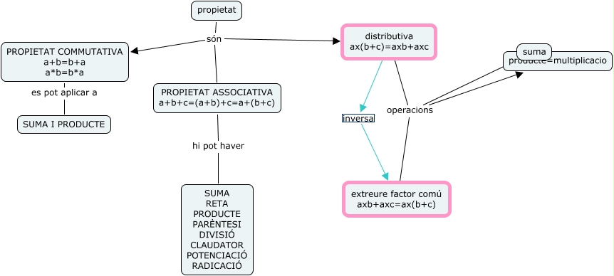 Aquest mapa conceptual conté informació relacionada amb: propietats, distributiva ax(b+c)=axb+axc operacions producte=multiplicacio, distributiva ax(b+c)=axb+axc inversa extreure factor comú axb+axc=ax(b+c), PROPIETAT ASSOCIATIVA a+b+c=(a+b)+c=a+(b+c) hi pot haver SUMA RETA PRODUCTE PARÈNTESI DIVISIÓ CLAUDATOR POTENCIACIÓ RADICACIÓ, propietat són PROPIETAT ASSOCIATIVA a+b+c=(a+b)+c=a+(b+c), propietat són distributiva ax(b+c)=axb+axc, propietat són PROPIETAT COMMUTATIVA a+b=b+a a*b=b*a, PROPIETAT COMMUTATIVA a+b=b+a a*b=b*a es pot aplicar a SUMA I PRODUCTE, distributiva ax(b+c)=axb+axc operacions suma, extreure factor comú axb+axc=ax(b+c) operacions producte=multiplicacio, extreure factor comú axb+axc=ax(b+c) operacions suma