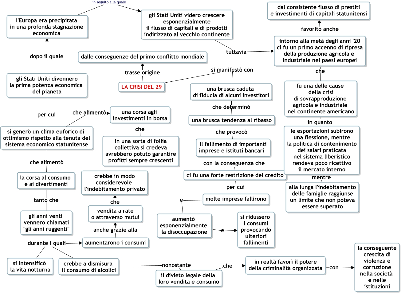 Questa Cmap, creata con IHMC CmapTools, contiene informazioni relative a: La crisi del '29, l'Europa era precipitata in una profonda stagnazione economica in seguito alla quale gli Stati Uniti videro crescere esponenzialmente il flusso di capitali e di prodotti indirizzato al vecchio continente, in realtà favorì il potere della criminalità organizzata con la conseguente crescita di violenza e corruzione nella società e nelle istituzioni, aumentarono i consumi anche grazie alla vendita a rate o attraverso mutui, dalle conseguenze del primo conflitto mondiale dopo il quale l'Europa era precipitata in una profonda stagnazione economica, intorno alla metà degli anni '20 ci fu un primo accenno di ripresa della produzione agricola e industriale nei paesi europei che fu una delle cause della crisi di sovrapproduzione agricola e industriale nel continente americano, il fallimento di importanti imprese e istituti bancari con la conseguenza che ci fu una forte restrizione del credito, il divieto legale della loro vendita e consumo che in realtà favorì il potere della criminalità organizzata, una brusca tendenza al ribasso che provocò il fallimento di importanti imprese e istituti bancari, LA CRISI DEL 29 si manifestò con una brusca caduta di fiducia di alcuni investitori, la corsa al consumo e ai divertimenti tanto che gli anni venti vennero chiamati "gli anni ruggenti", dalle conseguenze del primo conflitto mondiale dopo il quale gli Stati Uniti divennero la prima potenza economica del pianeta, gli anni venti vennero chiamati "gli anni ruggenti" durante i quali si intensificò la vita notturna, ci fu una forte restrizione del credito per cui molte imprese fallirono, gli anni venti vennero chiamati "gli anni ruggenti" durante i quali aumentarono i consumi, intorno alla metà degli anni '20 ci fu un primo accenno di ripresa della produzione agricola e industriale nei paesi europei favorito anche dal consistente flusso di prestiti e investimenti di capitali statunitensi, si generò un clima euforico di ottimismo rispetto alla tenuta del sistema economico statunitense che alimentò una corsa agli investimenti in borsa, molte imprese fallirono e aumentò esponenzialmente la disoccupazione, le esportazioni subirono una flessione, mentre la politica di contenimento dei salari praticata nel sistema liberistico rendeva poco ricettivo il mercato interno mentre alla lunga l'indebitamento delle famiglie raggiunse un limite che non poteva essere superato, vendita a rate o attraverso mutui che crebbe in modo considerevole l'indebitamento privato, aumentò esponenzialmente la disoccupazione e si ridussero i consumi provocando ulteriori fallimenti
