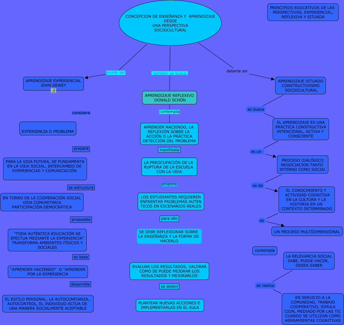 Este Cmap, tiene información relacionada con: PRINCIPIOS EDUCATIVOS1, LOS ESTUDIANTES REQUIEREN ENFRENTAR PROBLEMAS AUTEN TICOS EN ESCENARIOS REALES SE DEBE REFLEXIONAR SOBRE LA ENSEÑANZA Y LA FORMA DE HACERLO se deben, CONCEPCION DE ENSEÑANZA Y APRENDIZAJE DESDE UNA PERSPECTIVA SOCIOCULTURAL puede ser APRENDIZAJE EXPERIENCIAL JOHN DEWEY, PROCESO DIALÓGICO NEGOCIACION TANTO INTERNO COMO SOCIAL se da EL CONOCIMIENTO Y ACTIVIDAD COGNITIVA EN LA CULTURA Y LA HISTORIA EN UN CONTEXTO DETERMINADO, EL CONOCIMIENTO Y ACTIVIDAD COGNITIVA EN LA CULTURA Y LA HISTORIA EN UN CONTEXTO DETERMINADO es UN PROCESO MULTÍDIMENSIONAL, LA RELEVANCIA SOCIAL SABE, PUEDE HACER, DESEA SABER se realiza EN SERVICIO A LA COMUNIDAD, TRABAJO COOPERATIVO, SIMULA CION, MEDIADO POR LAS TIC CUANDO SE UTILIZAN COMO HERRAMIENTAS COGNITIVAS, CONCEPCION DE ENSEÑANZA Y APRENDIZAJE DESDE UNA PERSPECTIVA SOCIOCULTURAL también se busca APRENDIZAJE REFLEXIVO DONALD SCHÖN, CONCEPCION DE ENSEÑANZA Y APRENDIZAJE DESDE UNA PERSPECTIVA SOCIOCULTURAL debería ser APRENDIZAJE SITUADO CONSTRUCTIVISMO SOCIOCULTURAL, EL APRENDIZAJE ES UNA PRÁCTICA CONSTRUCTIVA INTENCIONAL, ACTIVA Y CONSCIENTE es un PROCESO DIALÓGICO NEGOCIACION TANTO INTERNO COMO SOCIAL, LA PREOCUPACIÓN DE LA RUPTURA DE LA ESCUELA CON LA VIDA propone para ello, APRENDIZAJE REFLEXIVO DONALD SCHÖN contempla APRENDER HACIENDO, LA REFLEXIÓN SOBRE LA ACCIÓN O LA PRÁCTICA DETECCIÓN DEL PROBLEMA, APRENDIZAJE EXPERIENCIAL JOHN DEWEY considera EXPERIENCIA O PROBLEMA, APRENDIZAJE SITUADO CONSTRUCTIVISMO SOCIOCULTURAL se busca EL APRENDIZAJE ES UNA PRÁCTICA CONSTRUCTIVA INTENCIONAL, ACTIVA Y CONSCIENTE