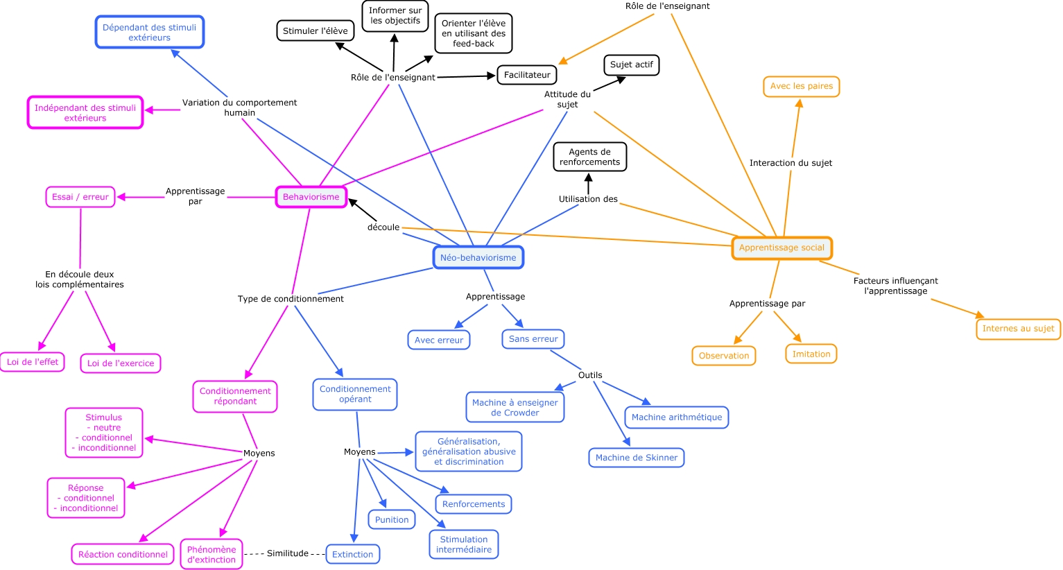 Cette carte de concepts créée avec IHMC CmapTools traite de: Behaviorisme - néo-behaviorisme et apprentissage social, Behaviorisme Rôle de l'enseignant Facilitateur, Néo-behaviorisme Apprentissage Sans erreur, Néo-behaviorisme Rôle de l'enseignant Stimuler l'élève, Conditionnement répondant Moyens Stimulus - neutre - conditionnel - inconditionnel, Conditionnement répondant Moyens Réaction conditionnel, Conditionnement opérant Moyens Extinction, Behaviorisme Variation du comportement humain Dépendant des stimuli extérieurs, Apprentissage social découle Behaviorisme, Conditionnement opérant Moyens Stimulation intermédiaire, Néo-behaviorisme Utilisation des Agents de renforcements, Néo-behaviorisme Variation du comportement humain Indépendant des stimuli extérieurs, Behaviorisme Rôle de l'enseignant Orienter l'élève en utilisant des feed-back, Conditionnement opérant Moyens Punition, Sans erreur Outils Machine arithmétique, Apprentissage social Utilisation des Agents de renforcements, Néo-behaviorisme Attitude du sujet Sujet actif, Néo-behaviorisme Apprentissage Avec erreur, Néo-behaviorisme Type de conditionnement Conditionnement répondant, Conditionnement opérant Moyens Généralisation, généralisation abusive et discrimination, Apprentissage social Apprentissage par Observation