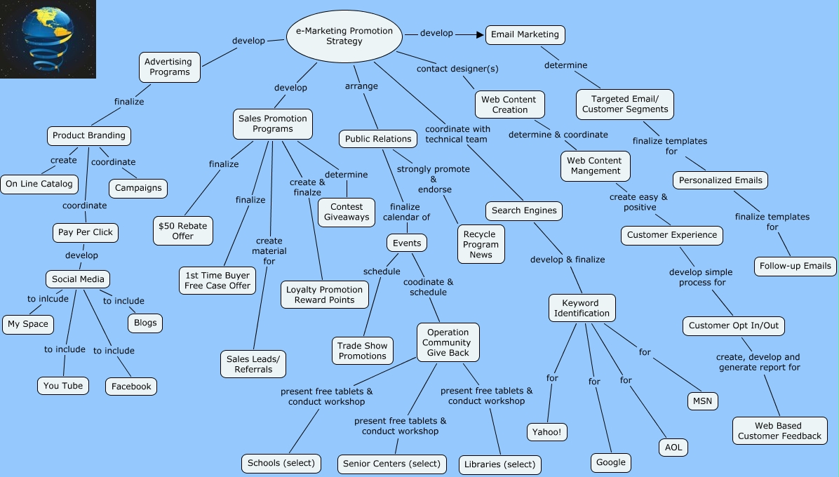This Concept Map, created with IHMC CmapTools, has information related to: e-Marketing Concept Map (Team 4 - Dream Portal), Events schedule Trade Show Promotions, e-Marketing Promotion Strategy develop Advertising Programs, Product Branding coordinate Campaigns, Operation Community Give Back present free tablets & conduct workshop Schools (select), Keyword Identification for Google, Events coodinate & schedule Operation Community Give Back, e-Marketing Promotion Strategy develop Sales Promotion Programs, Operation Community Give Back present free tablets & conduct workshop Senior Centers (select), Pay Per Click develop Social Media, Social Media to inlcude My Space, e-Marketing Promotion Strategy coordinate with technical team Search Engines, e-Marketing Promotion Strategy develop Email Marketing, Web Content Mangement create easy & positive Customer Experience, Advertising Programs finalize Product Branding, Keyword Identification for AOL, Social Media to include You Tube, Email Marketing determine Targeted Email/ Customer Segments, Customer Opt In/Out create, develop and generate report for Web Based Customer Feedback, Sales Promotion Programs create material for Sales Leads/ Referrals, Public Relations strongly promote & endorse Recycle Program News