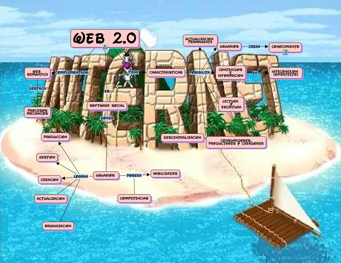 Este Cmap, tiene información relacionada con: Web 2.0, usuarios logran Producción, Usuarios crean Conocimiento, usuarios logran Gestión, Web 2.0 es Software Social, Web 2.0 tiene Características, usuarios poseen habilidades, Características Posibilita Consumidores, productores y creadores, Web Semántica destaca Procesos Mecánicos, Software Social donde usuarios, usuarios logran Organización, Web 2.0 complementada Web Semántica, Características Posibilita Descentralización, Características Posibilita Contenidos e información, Características Posibilita Lectura y escritura, usuarios logran Actualización, usuarios logran Creación, Contenidos e información en Inteconexión (Hipertexto), usuarios poseen Competencias, Características Posibilita Actualización permanente, Características Posibilita Usuarios