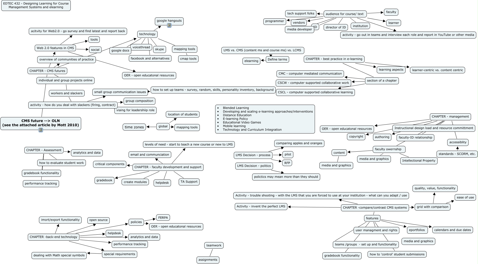 This Concept Map, created with IHMC CmapTools, has information related to: EDTEC 432 brainstorm, audience for course/ text tech support folks, CHAPTER - management facutly-ID relationship, mapping tools cmap tools, features gradebook functionality, CHAPTER -back-end technology policies, grid with comparison ease of use, features eportfolios, small group communication issues how to set up teams - survey, random, skills, personality inventory, background, standards - SCORM, etc. accessiblity, Web 2.0 features in CMS acitvity for Web2.0 - go survey and find latest and report back, CHAPTER - faculty development and support gradebook, technology google hangouts, CHAPTER - faculty development and support levels of need - start to teach a new course or new to LMS, audience for course/ text institution, LMS Decision - process comparing apples and oranges, CHAPTER -back-end technology open source, CHAPTER -compare/contrast CMS systems Activity - trouble shooting - with the LMS that you are forced to use at your institution - what can you adapt / use, faculty owernship content, faculty owernship Intellectional Property, features calendars and due dates
