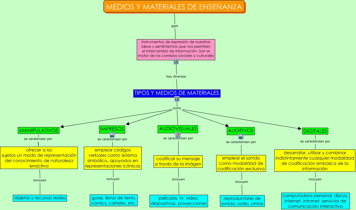 Este Cmap, tiene información relacionada con: medios y materiales de enseñanza, AUDIOVISUALES se caracterizan por codificar su mensaje a través de la imágen, emplear códigos verbales como sistema simbólico, apoyados en representaciones icónicas incluyen guías, libros de texto, comics, carteles, etc., emplear el sonido como modalidad de codificación exclusiva incluyen reproductores de sonido, radio, cintas, IMPRESOS se caracterizan por emplear códigos verbales como sistema simbólico, apoyados en representaciones icónicas, codificar su mensaje a través de la imágen incluyen películas, tv, video, diapositivas, proyecciones, ofrecer a los sujetos un modo de representación del conocimiento de naturaleza enactiva incluyen objetos y recursos reales, TIPOS Y MEDIOS DE MATERIALES como AUDITIVOS, desarrollar, utilizar y combinar indistintamente cualquier modalidad de codificación simbólica de la información incluyen computadora personal, discos, internet, intranet, servicios de comunicación interactiva, TIPOS Y MEDIOS DE MATERIALES como MANIPULATIVOS, MEDIOS Y MATERIALES DE ENSEÑANZA son Instrumentos de expresión de nuestras ideas y sentimientos que nos permiten el intercambio de información. Son el motor de los cambios sociales y culturales, TIPOS Y MEDIOS DE MATERIALES como AUDIOVISUALES, TIPOS Y MEDIOS DE MATERIALES como IMPRESOS, TIPOS Y MEDIOS DE MATERIALES como DIGITALES, Instrumentos de expresión de nuestras ideas y sentimientos que nos permiten el intercambio de información. Son el motor de los cambios sociales y culturales hay diversos TIPOS Y MEDIOS DE MATERIALES, MANIPULATIVOS se caraterizan por ofrecer a los sujetos un modo de representación del conocimiento de naturaleza enactiva, AUDITIVOS se caracterizan por emplear el sonido como modalidad de codificación exclusiva, DIGITALES se caracterizan por desarrollar, utilizar y combinar indistintamente cualquier modalidad de codificación simbólica de la información
