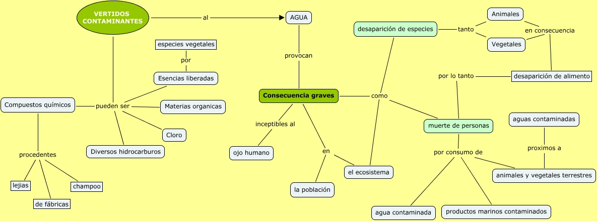 Este Cmap, tiene información relacionada con: Vertidos Contaminantes, Consecuencia graves en la población, Consecuencia graves en el ecosistema, desaparición de especies tanto Vegetales, VERTIDOS CONTAMINANTES pueden ser Esencias liberadas, VERTIDOS CONTAMINANTES al AGUA, el ecosistema como muerte de personas, Compuestos químicos procedentes lejias, VERTIDOS CONTAMINANTES pueden ser Cloro, animales y vegetales terrestres proximos a aguas contaminadas, Esencias liberadas por especies vegetales, Compuestos químicos procedentes de fábricas, VERTIDOS CONTAMINANTES pueden ser Compuestos químicos, Animales en consecuencia desaparición de alimento, muerte de personas por consumo de animales y vegetales terrestres, Consecuencia graves inceptibles al ojo humano, el ecosistema como desaparición de especies, VERTIDOS CONTAMINANTES pueden ser Diversos hidrocarburos, muerte de personas por consumo de productos marinos contaminados, Compuestos químicos procedentes champoo, Consecuencia graves como muerte de personas