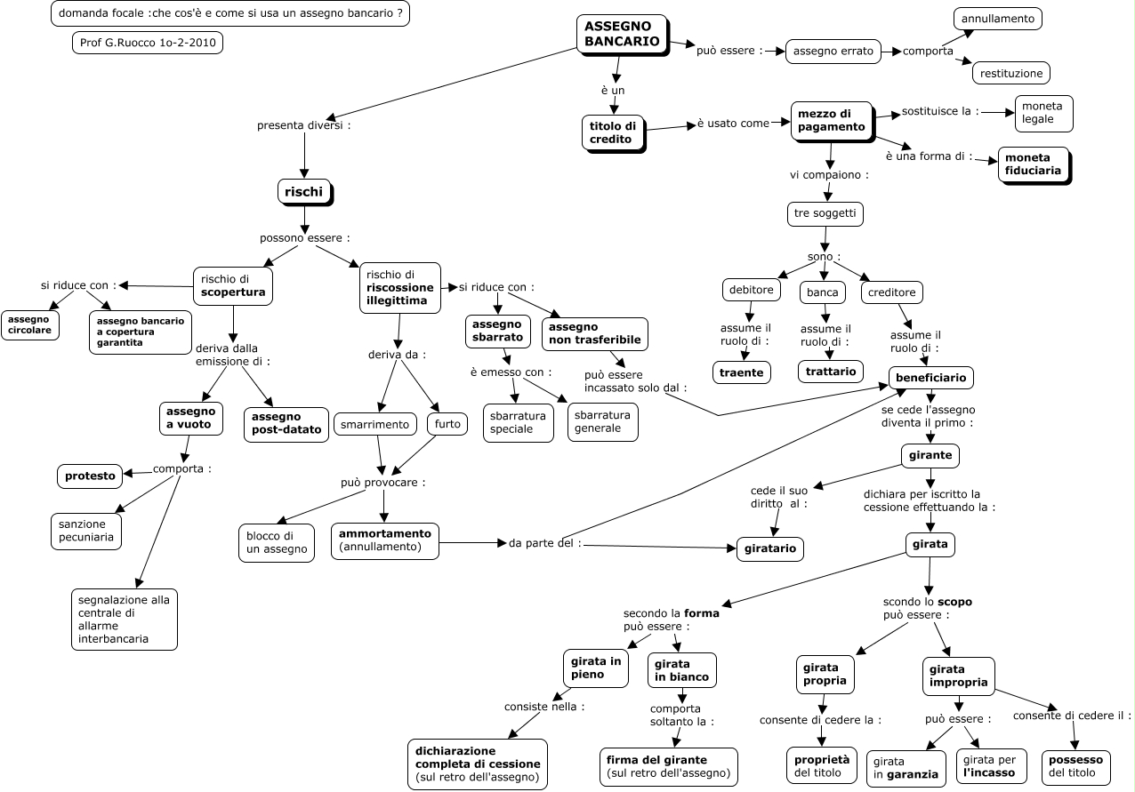 Questa Cmap, creata con IHMC CmapTools, contiene informazioni relative a: assegno bancario -emissione-girate-rischi-Prof G. Ruocco-BN, rischio di riscossione illegittima deriva da : smarrimento, assegno errato comporta restituzione, girata propria consente di cedere la : proprietà del titolo, assegno sbarrato è emesso con : sbarratura speciale, tre soggetti sono : banca, smarrimento può provocare : blocco di un assegno, mezzo di pagamento sostituisce la : moneta legale, ASSEGNO BANCARIO presenta diversi : rischi, tre soggetti sono : creditore, furto può provocare : blocco di un assegno, ASSEGNO BANCARIO può essere : assegno errato, girata in pieno consiste nella : dichiarazione completa di cessione (sul retro dell'assegno), banca assume il ruolo di : trattario, assegno errato comporta annullamento, girata scondo lo scopo può essere : girata propria, girata scondo lo scopo può essere : girata impropria, girante cede il suo diritto al : giratario, assegno a vuoto comporta : protesto, rischio di riscossione illegittima si riduce con : assegno sbarrato, girante dichiara per iscritto la cessione effettuando la : girata