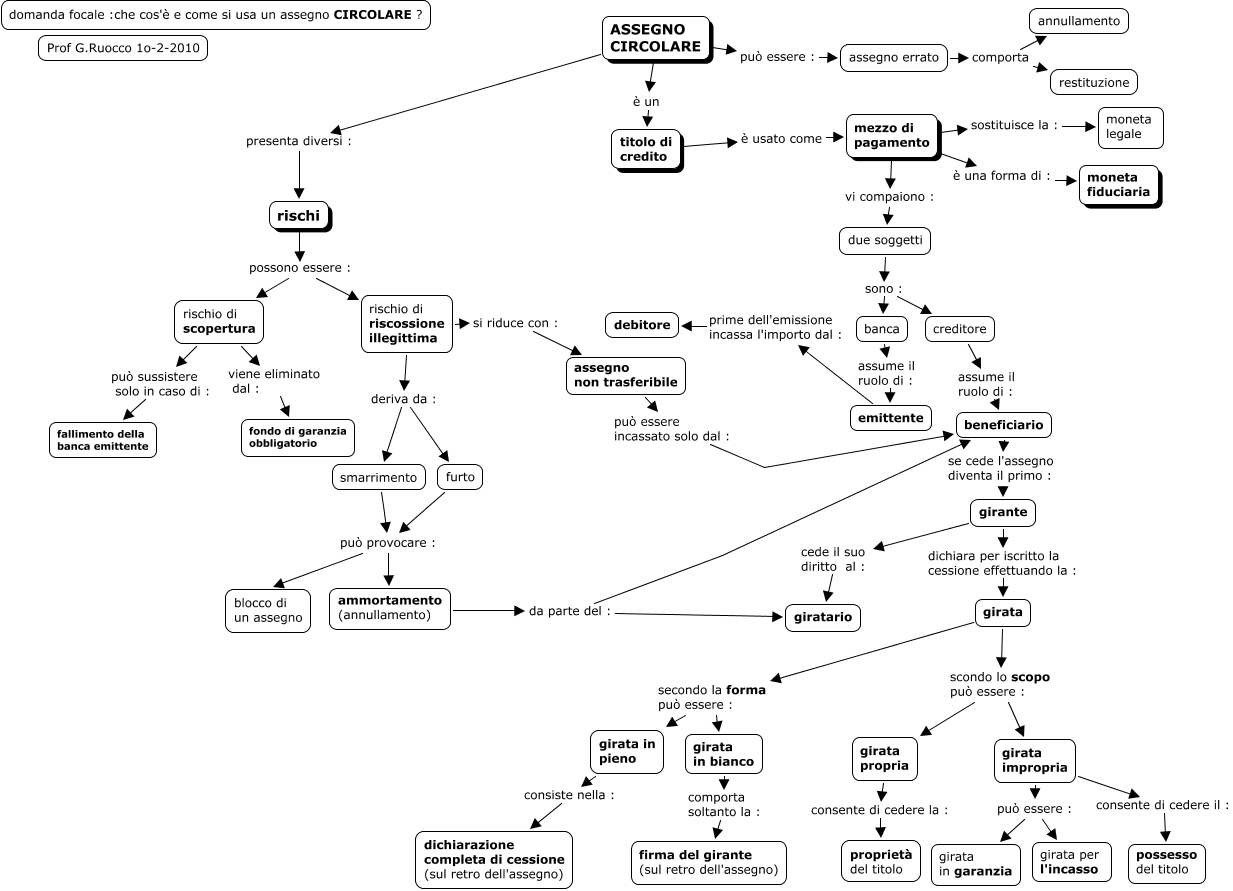 Questa Cmap, creata con IHMC CmapTools, contiene informazioni relative a: assegno CIRCOLARE -emissione-girate-rischi-Prof G. Ruocco-BN, girata impropria può essere : girata in garanzia, furto può provocare : ammortamento (annullamento), beneficiario se cede l'assegno diventa il primo : girante, girata in bianco comporta soltanto la : firma del girante (sul retro dell'assegno), rischio di riscossione illegittima deriva da : furto, girata secondo la forma può essere : girata in pieno, girata scondo lo scopo può essere : girata impropria, due soggetti sono : creditore, due soggetti sono : banca, girata secondo la forma può essere : girata in bianco, furto può provocare : blocco di un assegno, ammortamento (annullamento) da parte del : beneficiario, rischio di scopertura può sussistere solo in caso di : fallimento della banca emittente, assegno errato comporta annullamento, rischio di riscossione illegittima deriva da : smarrimento, rischio di riscossione illegittima si riduce con : assegno non trasferibile, titolo di credito è usato come mezzo di pagamento, rischi possono essere : rischio di scopertura, girata propria consente di cedere la : proprietà del titolo, assegno non trasferibile può essere incassato solo dal : beneficiario