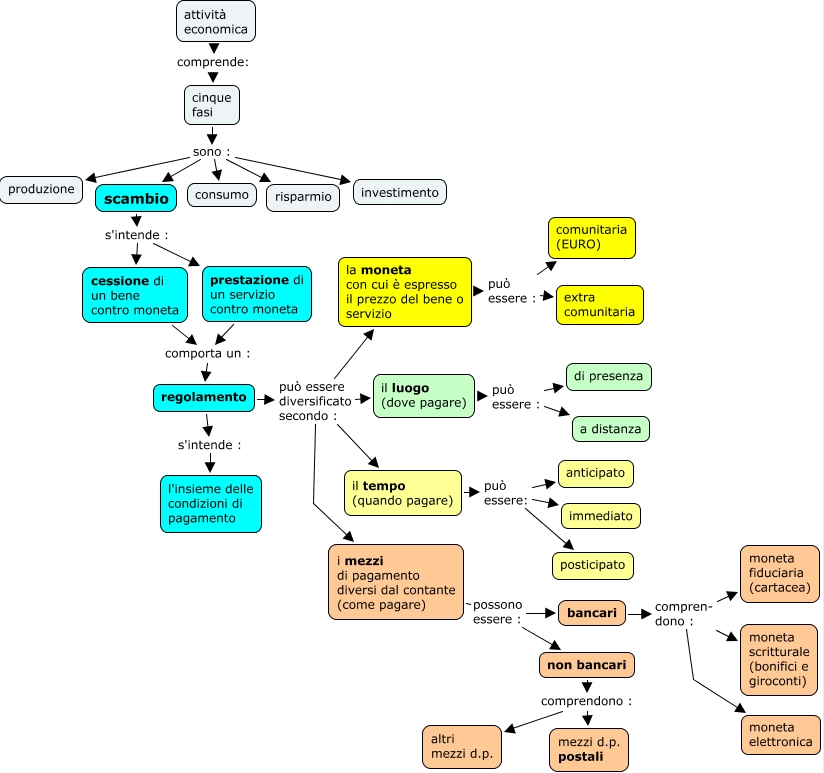 Questa Cmap, creata con IHMC CmapTools, contiene informazioni relative a: Scambio-mezzi e clausole di regolamento-COLORATA, regolamento s'intende : l'insieme delle condizioni di pagamento, cinque fasi sono : investimento, bancari compren- dono : moneta fiduciaria (cartacea), regolamento può essere diversificato secondo : il tempo (quando pagare), attività economica comprende: cinque fasi, la moneta con cui è espresso il prezzo del bene o servizio può essere : extra comunitaria, cessione di un bene contro moneta comporta un : regolamento, il tempo (quando pagare) può essere: immediato, la moneta con cui è espresso il prezzo del bene o servizio può essere : comunitaria (EURO), il luogo (dove pagare) può essere : di presenza, il tempo (quando pagare) può essere: posticipato, scambio s'intende : cessione di un bene contro moneta, scambio s'intende : prestazione di un servizio contro moneta, regolamento può essere diversificato secondo : la moneta con cui è espresso il prezzo del bene o servizio, bancari compren- dono : moneta elettronica, non bancari comprendono : altri mezzi d.p., regolamento può essere diversificato secondo : i mezzi di pagamento diversi dal contante (come pagare), bancari compren- dono : moneta scritturale (bonifici e giroconti), regolamento può essere diversificato secondo : il luogo (dove pagare), prestazione di un servizio contro moneta comporta un : regolamento