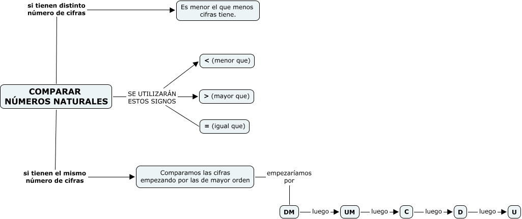 Este Cmap, tiene información relacionada con: Comparación de Números Naturales.cmap, COMPARAR NÚMEROS NATURALES SE UTILIZARÁN ESTOS SIGNOS = (igual que), COMPARAR NÚMEROS NATURALES si tienen distinto número de cifras Es menor el que menos cifras tiene., C luego D, COMPARAR NÚMEROS NATURALES SE UTILIZARÁN ESTOS SIGNOS > (mayor que), DM luego UM, COMPARAR NÚMEROS NATURALES SE UTILIZARÁN ESTOS SIGNOS < (menor que), Comparamos las cifras empezando por las de mayor orden empezaríamos por DM, D luego U, COMPARAR NÚMEROS NATURALES si tienen el mismo número de cifras Comparamos las cifras empezando por las de mayor orden, UM luego C